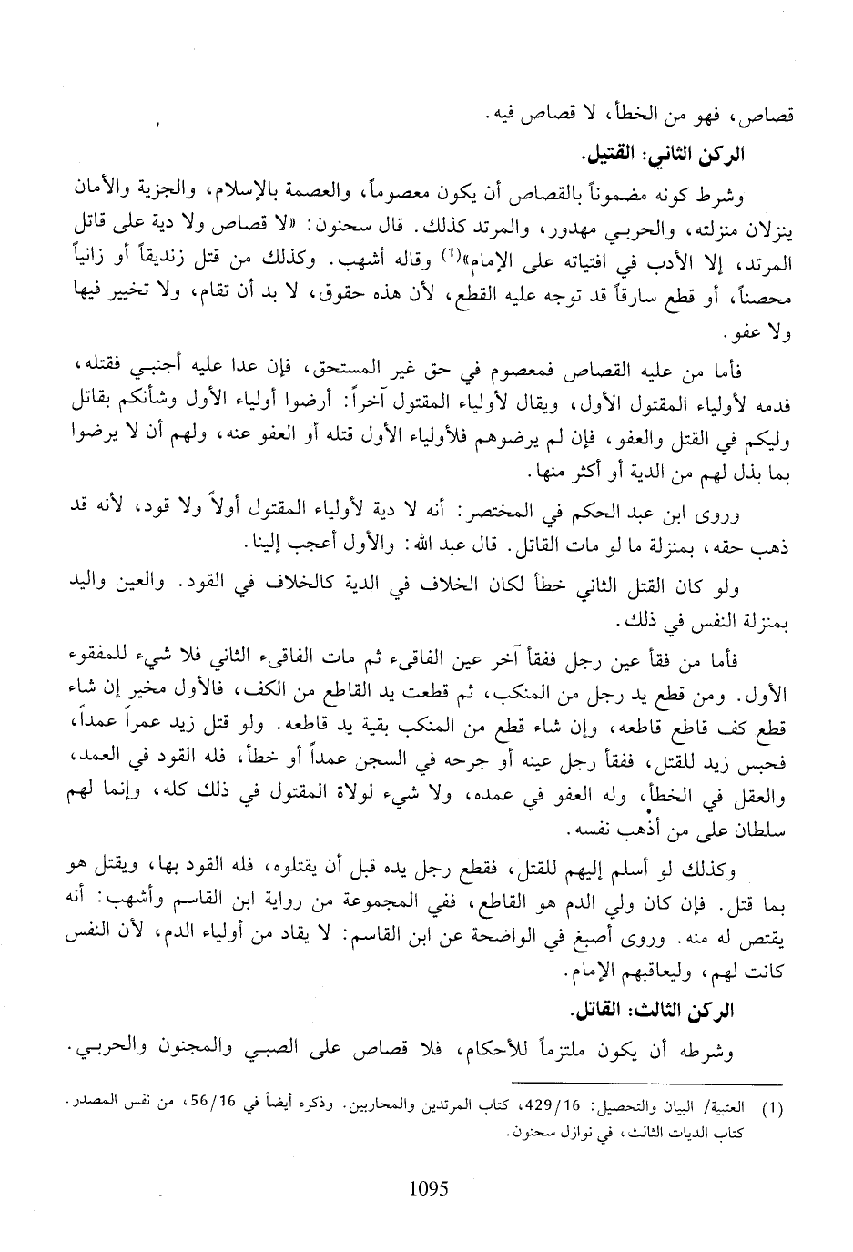 وشرط كونه مضمونًا بالقصاص أن يكون معصومًا، والعصمة بالإسلام، والجزية والأمان ينزلان منزلته، والحربي مهدور، والمرتد كذلك. قال سحنون: "لا قصاص ولا دية على قاتل المرتد، إلا الأدب في افتياته على الإمام" وقاله أشهب. وكذلك من قتل زنديقًا أو زانيًا محصنًا، أو قطع سارقًا قد توجه عليه القطع، لأن هذه حقوق، لابد أن تقام، ولا تخيير فيها ولا عفو.