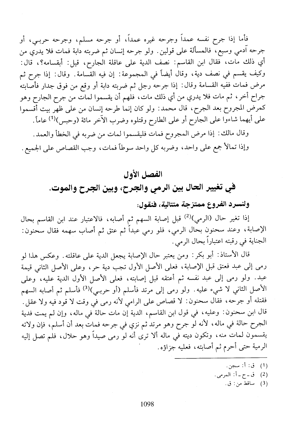 الفصل الأول: في تغيير الحال بين الرمي والجرح، وبين الجرح والموت