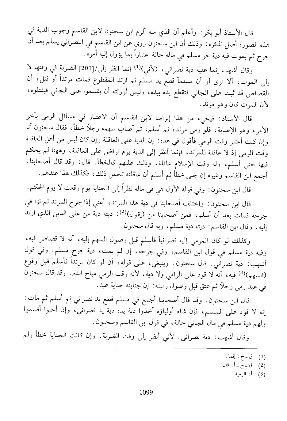 قال الاستاذ أبو بكر: وأعلم أن الذي منه ألزم ابن سحنون لابن القاسم وجوب الدية في هذه الصورة أصل نذكره: وذلك أن ابن سحنون روى عن ابن القاسم في النصراني يسلم بعد أن جرح ثم يموت فيه دية حر مسلم في ماله حاله اعتباراً بما يؤول إليه أمره.