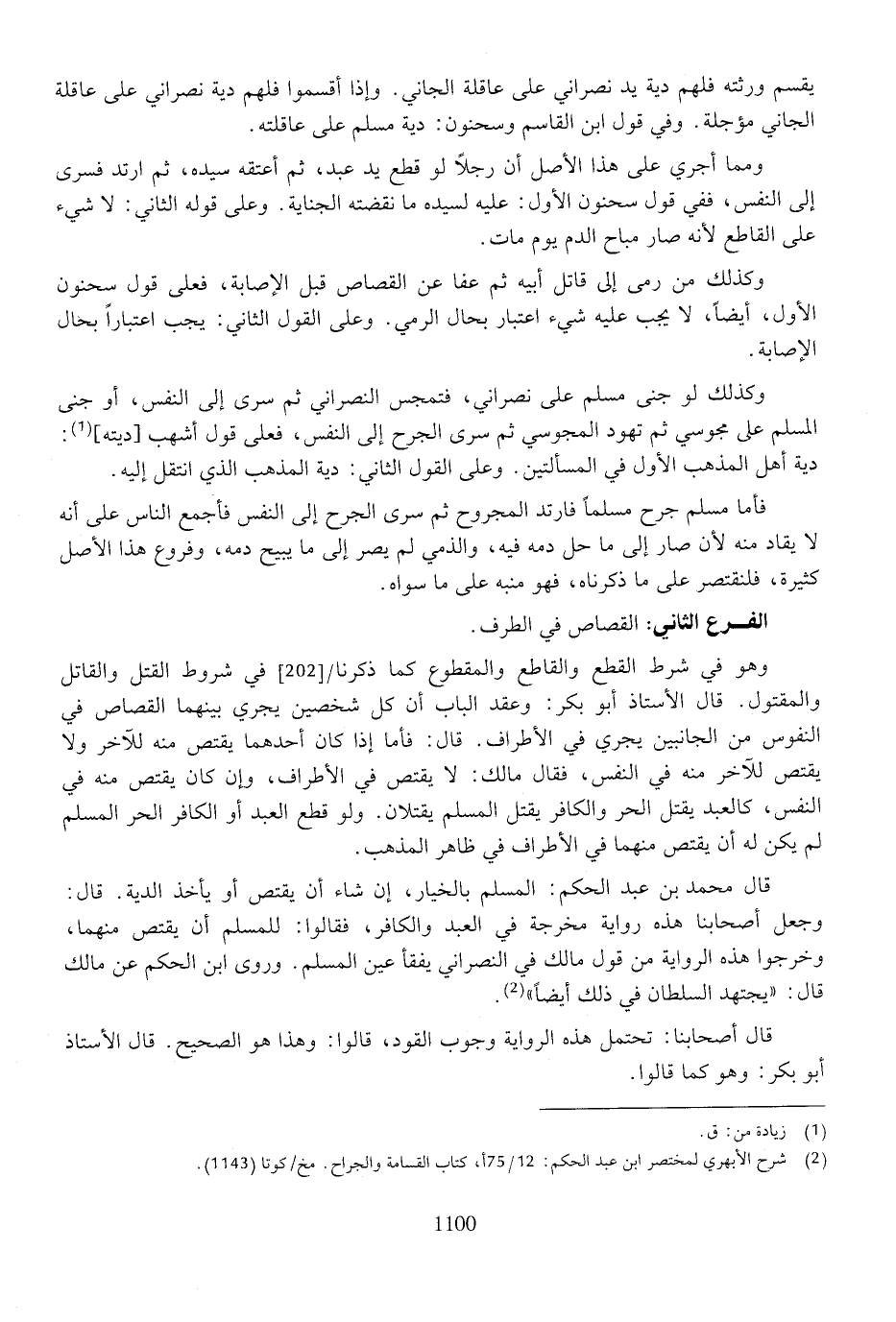 قال محمد بن عبد الحكم: المسلم بالخيار، إن شاء أن يقتص أو يأخذ الدية. قال: وجعل أصحابنا هذه رواية مخرجة في العبد والكافر، فقالوا: للمسلم أن يقتص منهما، وخرجوا هذه الرواية من قول مالك في النصراني يفقأ عين المسلم. وروى ابن الحكم عن مالك قال: "يجتهد السلطان في ذلك أيضًا".