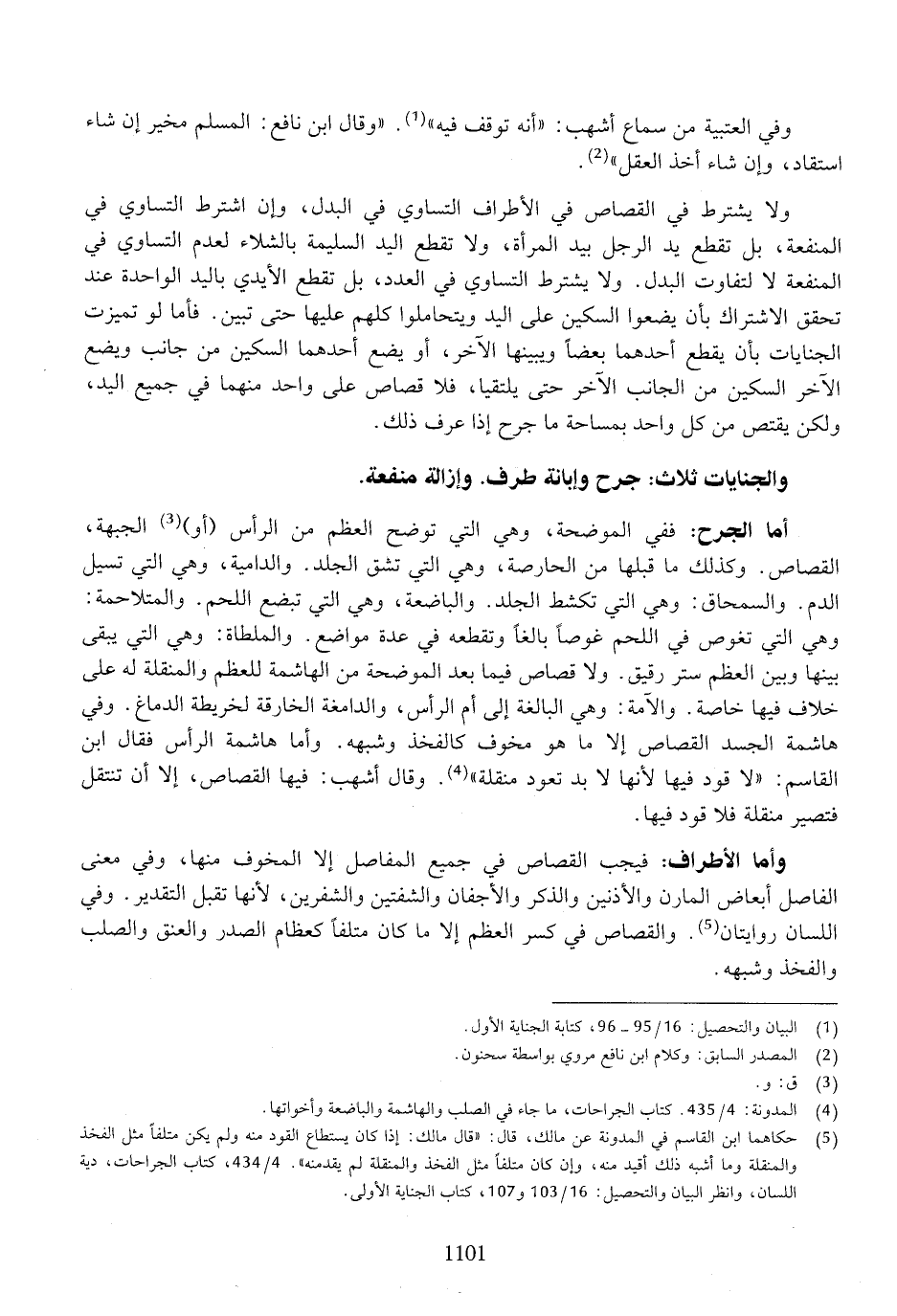 أما الجرح: ففي الموضحة، وهي التي توضح العظم من الرأس (أو) الجبهة، القصاص. وكذلك ما قبلها من الحاصرصة، وهي التي تشق الجلد. والدامية، وهي التي تسيل الدم. والسمحاق: وهي التي تكشط الجلد. والباضعة، وهي التي تبضع اللحم. والمتلاحمة: وهي التي تغوص في اللحم غوصًا بالغًا وتقطعه في عدة مواضع. والملطاة: وهي التي يبقى بينها وبين العظم ستر رقيق. ولا قصاص فيما بعد الموضحة من الهاشمة للعظم والمنقلة له على خلاف فيها خاصة. والآمة: وهي البالغة إلى أم الرأس، والدامغة الخارقة لخريطة الدماغ. وفي هاشمة الجسد القصاص إلا ما هو مخوف كالفخذ وشبهه. وأما هاشمة الرأس فقال ابن القاسم: "لا قود فيها لأنها لابد تعود منقلة". وقال أشهب: فيها القصاص، إلا أن تنتقل فتصير منقلة فلا قود فيها.
