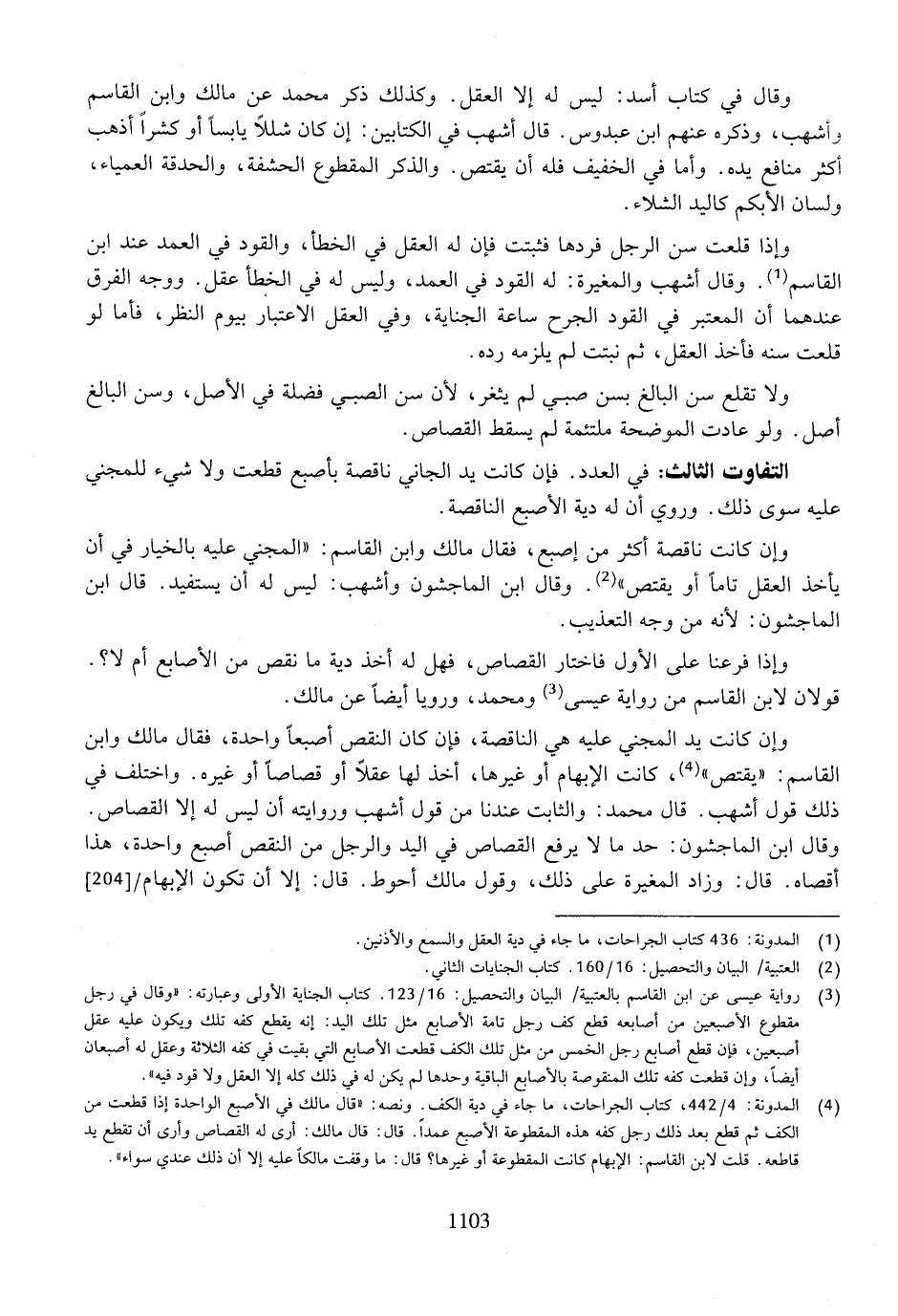 وقال في كتاب أسد: ليس له إلا العقل. وكذلك ذكر محمد عن مالك وابن القاسم وأشهب، وذكره عنهم ابن عبدوس. قال أشهب في الكتابين: إن كان شللاً يابسًا أو كثرًا أذهب أكثر منافع يده. وأما في الخفيف فله أن يقتص. والذكر المقطوع الحشفة، والحدقة العمياء، ولسان الأبكم كاليد الشلاء.