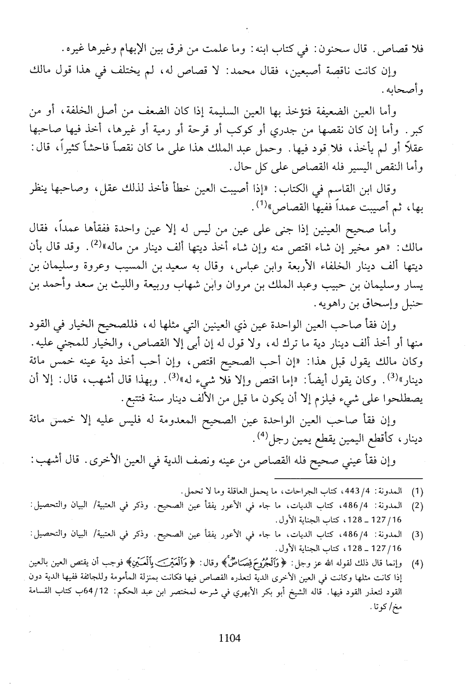 وأما صحيح العينين إذا جنى على عين من ليس له إلا عين واحدة ففقأها عمدًا، فقال مالك: "هو مخير إن شاء اقتص منه وإن شاء أخذ ديتها ألف دينار من ماله. وقد قال بأن ديتها ألف دينار الخلفاء الأربعة وابن عباس، وقال به سعيد بن المسيب وعروة وسليمان بن يسار وسليمان بن حبيب وعبد الملك بن مروان وابن شهاب وربيعة والليث بن سعد وأحمد بن حنبل وإسحاق بن راهويه.