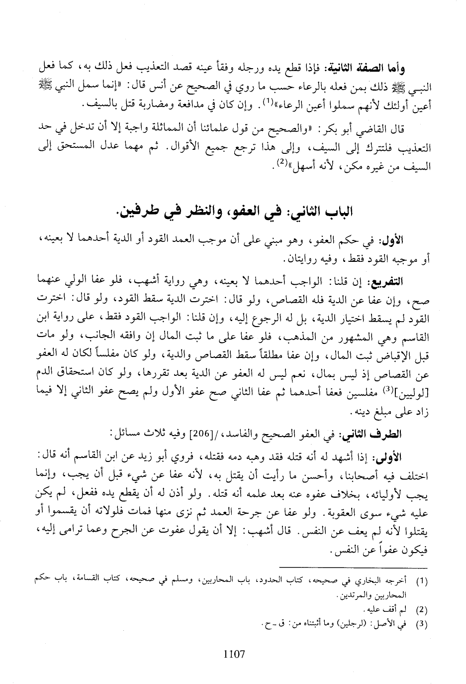 وأما الصفة الثانية: فإذا قطع يده ورجله وفقأ عينه قصد التعذيب فعل ذلك به، كما فعل النبي صلى الله عليه وسلم ذلك بمن فعله بالرعاء حسب ما روي في الصحيح عن أنس قال: "إنما سمل النبي صلى الله عليه وسلم أولئك لانهم سملوا أعين الرعاء". وإن كان مدافعة ومضاربة قتل بالسيف.