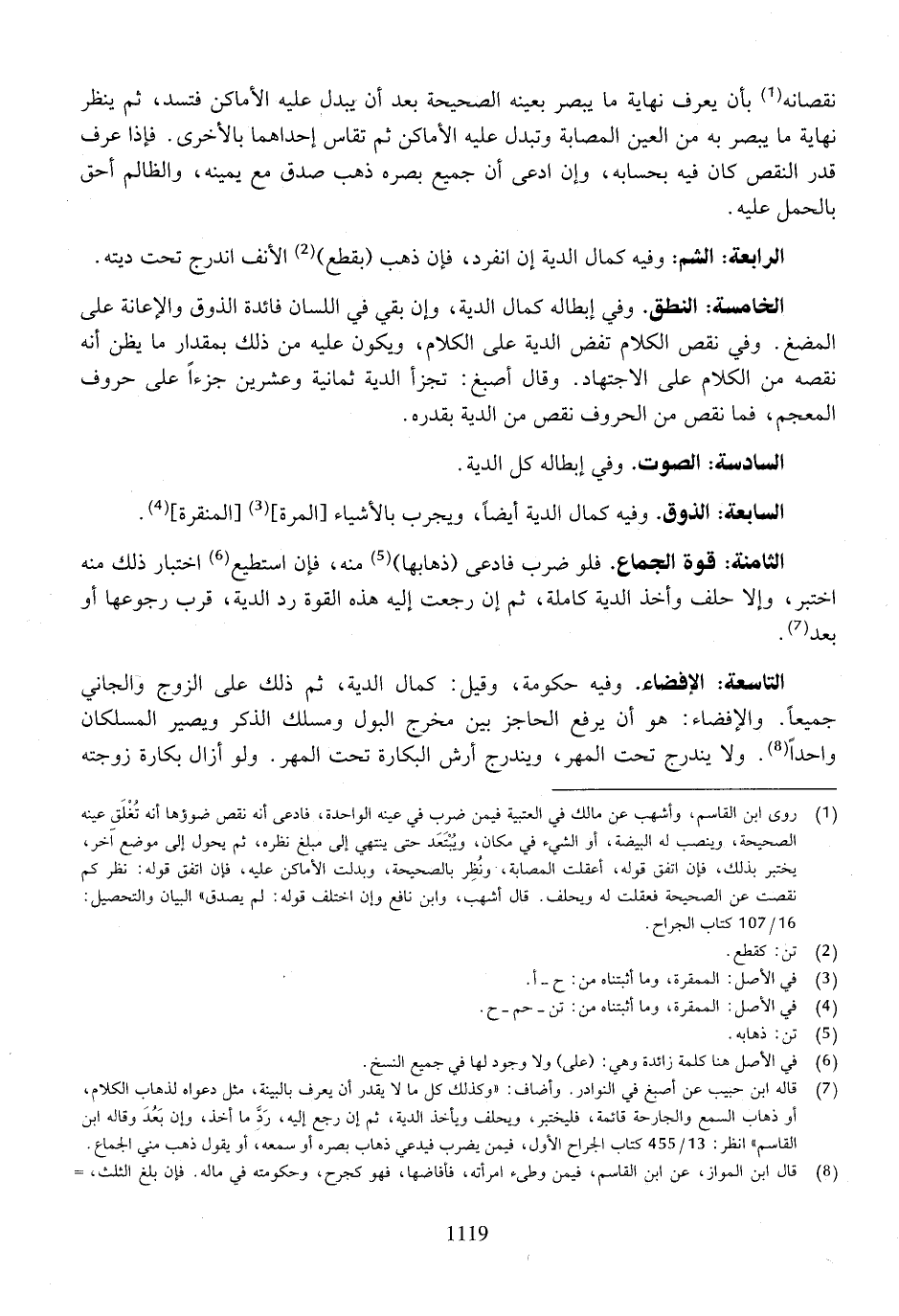 الخامسة: النطق: وفي إبطاله كمال الدية، وإن بقي في اللسان فائدة الذوق والإعانة على المضغ. وفي نقص الكلام نفض الدية على الكلام، ويكون عليه من ذلك بمقدار ما يظن أنه نقصه من الكلام على الاجتهاد. وقال أصبغ: تجزأ الدية ثامنية وعشرين جزءًا على حروف المعجم، فما نقص من الحروف نقص من الدية بقدره.