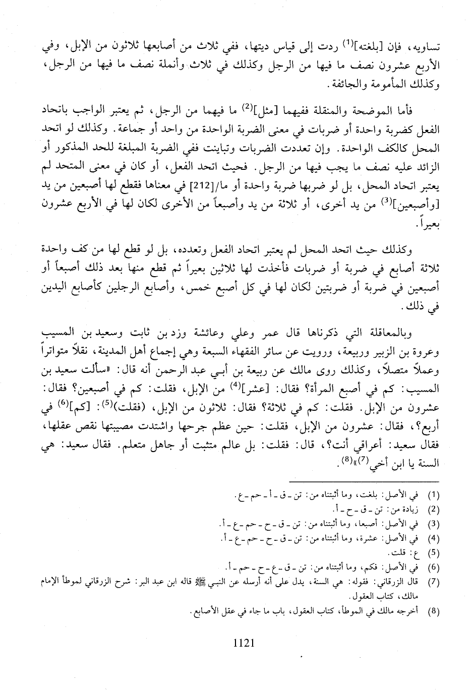 وبالمعاقلة التي ذكرناها قال عمر وعلي وعائشة وزيد بن ثابت وسعيد بن المسيب وعروة بن الزبير وربيعة، ورويت عن سائر الفقهاء السبعة وهي إجماع أهل المدينة، نقلاً متواترصا وعملاً متصلاً، وكذلك روى مالك عن ربيعة بن أبي عبد الرحمن أنه قال: "سألت سعيد بن المسيب: كم في أصبع المرأة؟ فقال: [عشر] من الإبل، فقلت: كم في أصبعين؟ فقال: عشرون من الإبل. فقلت: حين عظم جرحها واشتدت مصيبتها نقص عقلها، فقال سعيد: أعراقي أنت؟، قال: فقلت: بل عالم مثبت أو جاهل متعلم. فقال سعيد: هي السنة يا ابن أخي".