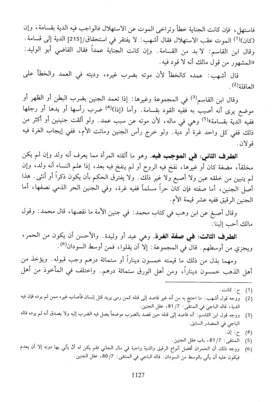 الطرف الثاني: في الموجب فيه. وهو ما ألقته المرأة مما يعرف أنه ولد وإن لم يكن مخلقًا، مضغة كان أو غيرها، نفخ فيه الروح أو لم ينفخ فيه بعد، إذا علم النساء أنه ولد، وإن لم يتبين من خلقه عين ولا أصبع ولا غير ذلك. ولا يفترق الحكم بأن يكون ذكراً أو أنثى. هذا أصل الجنين، أما صفته فإن كان حرًا مسلمًا ففيه غرة، وفي الجنين الحر الذمي نصفها، أما الجنين الرقيق ففيه عشر قيمة الأم.