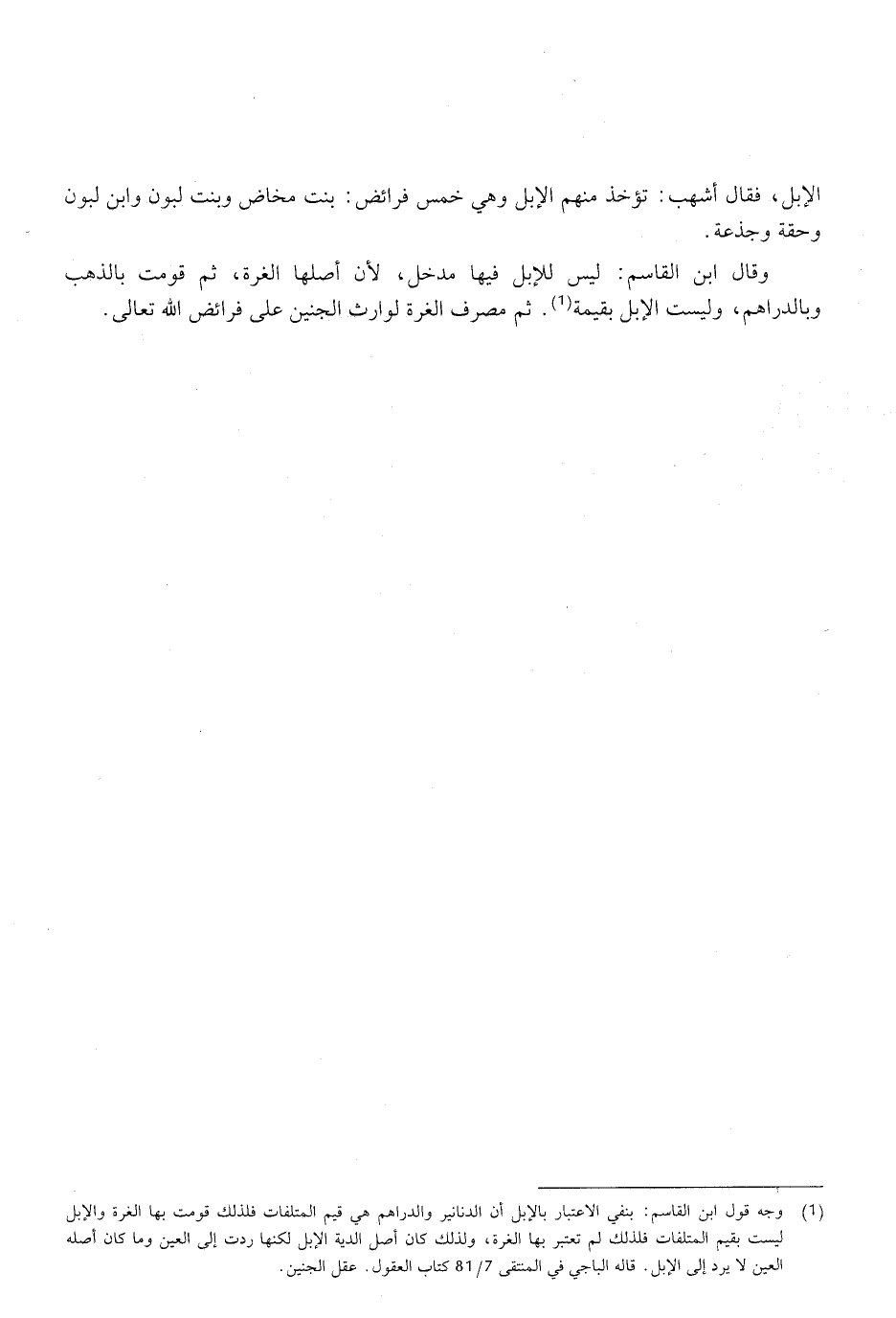 وقال ابن القاسم: ليس للإبل فيها مدخل، لان أصلها الغرة، ثم قومت بالذهب وبالدراهم، وليست الإبل بقيمة. ثم مصرف الغرة لوارث الجنين على فرائض الله تعالى.