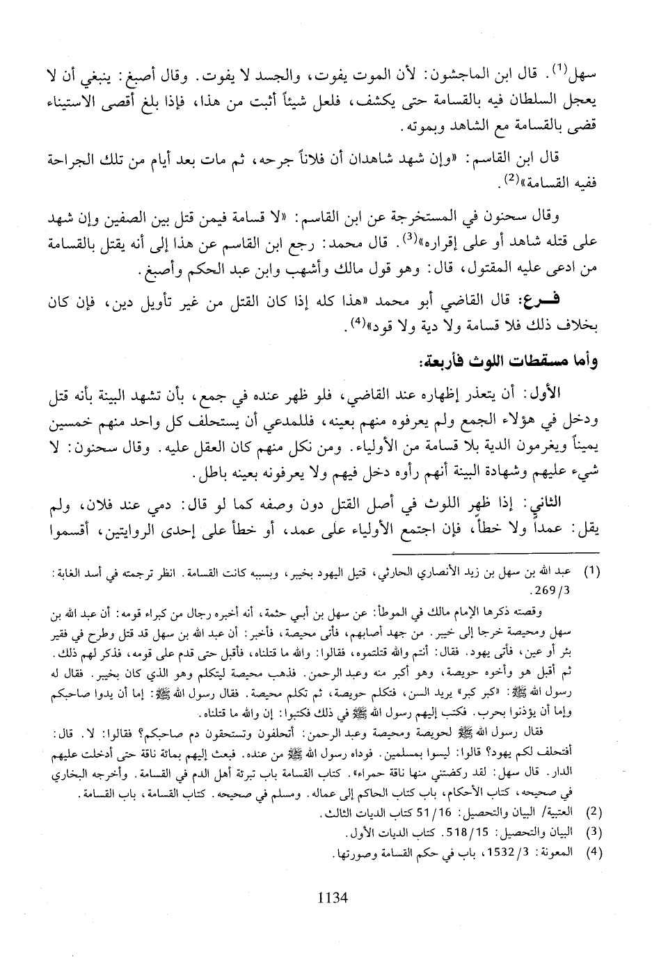 سهل. قال ابن الماجشون: لأن الموت يفوت، والجسد لا يفوت. وقال أصبغ: ينبغي أن لا يعجل السلطان فيه بالقسامة حتى يكشف، ف لعل شيئًا أثبت من هذا، فإذا بلغ أقصى الاستيناء قضى بالقسامة مع الشاهد وبموته.
