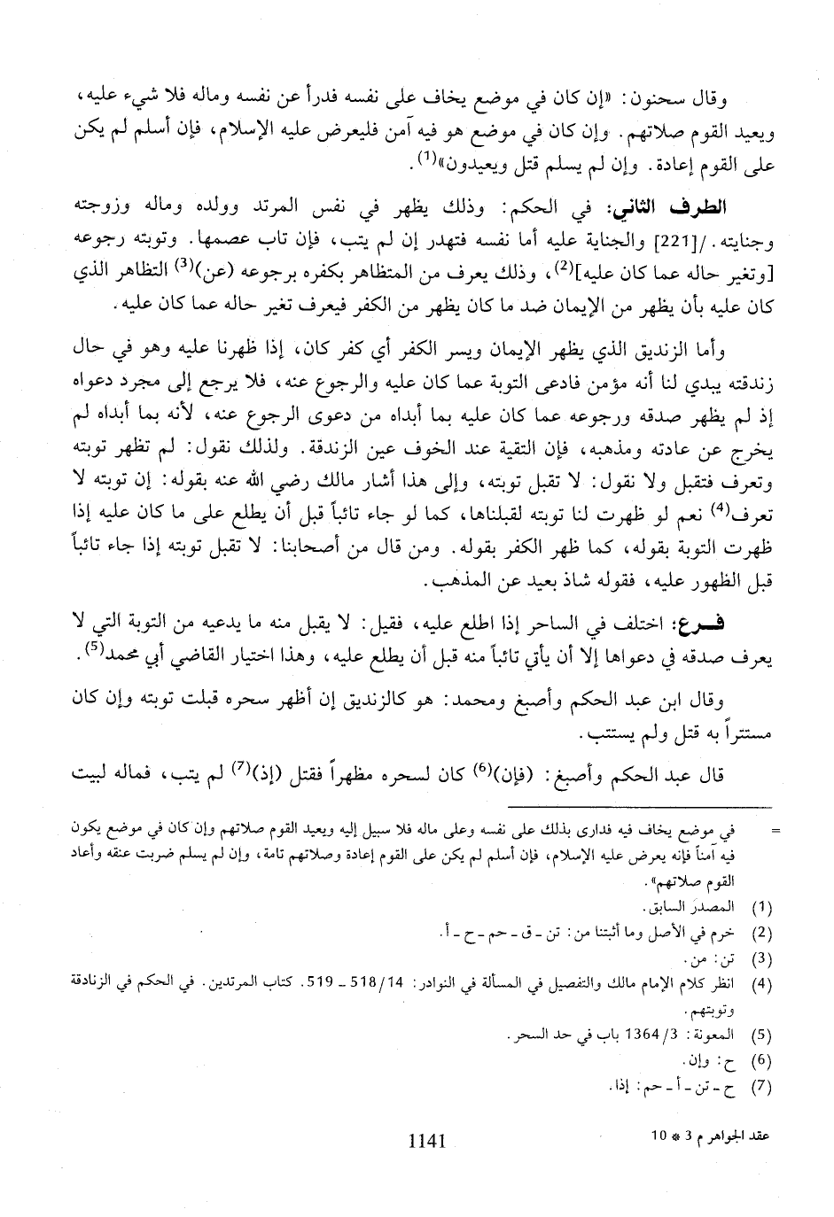 وأما الزنديق الذي يظهر الإيمان ويسر الكفر أي كفر كان، إذا ظهرنا عليه وهو في حال زندقته يبدي لنا أنه مؤمن فادعى التوبة عما كان عليه والرجوع عنه، فلا يرجع إلى مجرد دعواه إذ لم يظهر صدقه ورجوعه عما كان عليه بما أبداه من دعوى الرجوع عنه، لأنه بما أبداه لم يخرج عن عادته ومذهبه، فإن التقية عند الخوف عين الزندقة. ولذلك نقول: لم تظهر توبته وتعرف فتقبل ولا نقلو: لا تقبل توبته، وإلى هذا أشار مالك رضي الله عنه بقوله: إن توبته لا تعرف نعم لو ظهرت لنا توبته لقبلناها، كما لو جاء تائبًال قبل أن يطلع على ما كان عليه إذا ظهرت التوبة بقوله، كما ظهر الكفر بقوله. ومن قال من أصحابنا: لا تقبل توبته إذا جاء تائبًا قبل الظهور عليه، فقوله شاذ بعيد عن المذهب.
