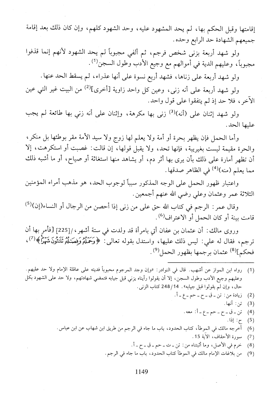 وقال عمر: الرجم في كتاب الله حق على من زنى إذا أحصن من الرجال أو النساء (إن) ترجم، فقال له علي: ليس ذلك عليها، واستدل بقوله تعالى: (وحمله وفصله ثلثون شهرًا)، فحكم] عثمان برجمها بظهور الحمل.
