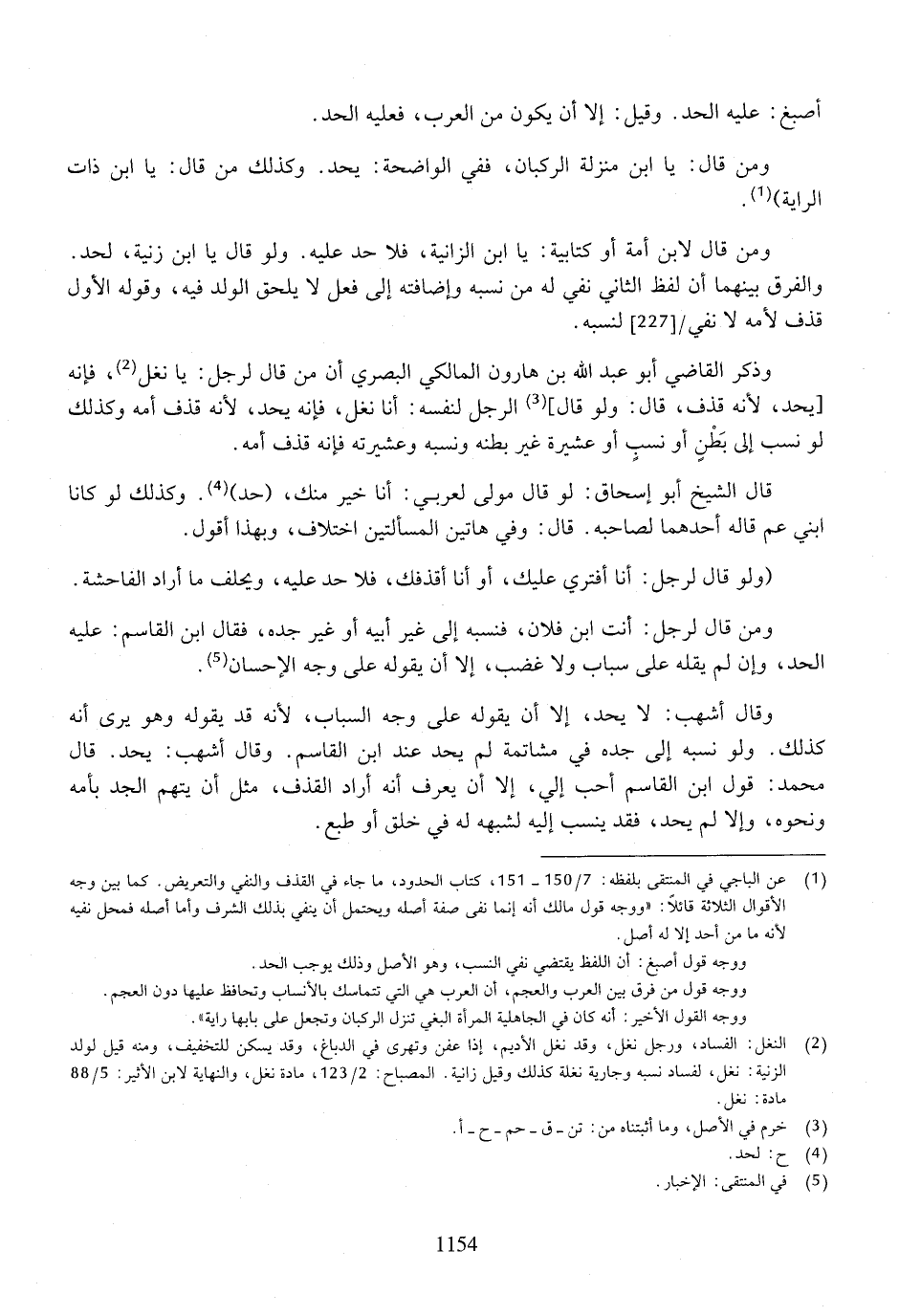 وذكر القاضي أبو عبد الهل بن هارون المالكي البصري أن من قال لرجل: يا نغل، فإنه [يحد، لأنه قذف، قال: ولو قال] الرجل لنفسه: أنا نغل، فإنه يحد، لأنه قذف أمه وكذلك لو نسب إلى بَطْنِ أو نسبٍ أو عشيرة غير بطنه ونسبه وعشيرته فإن قذف أمه.