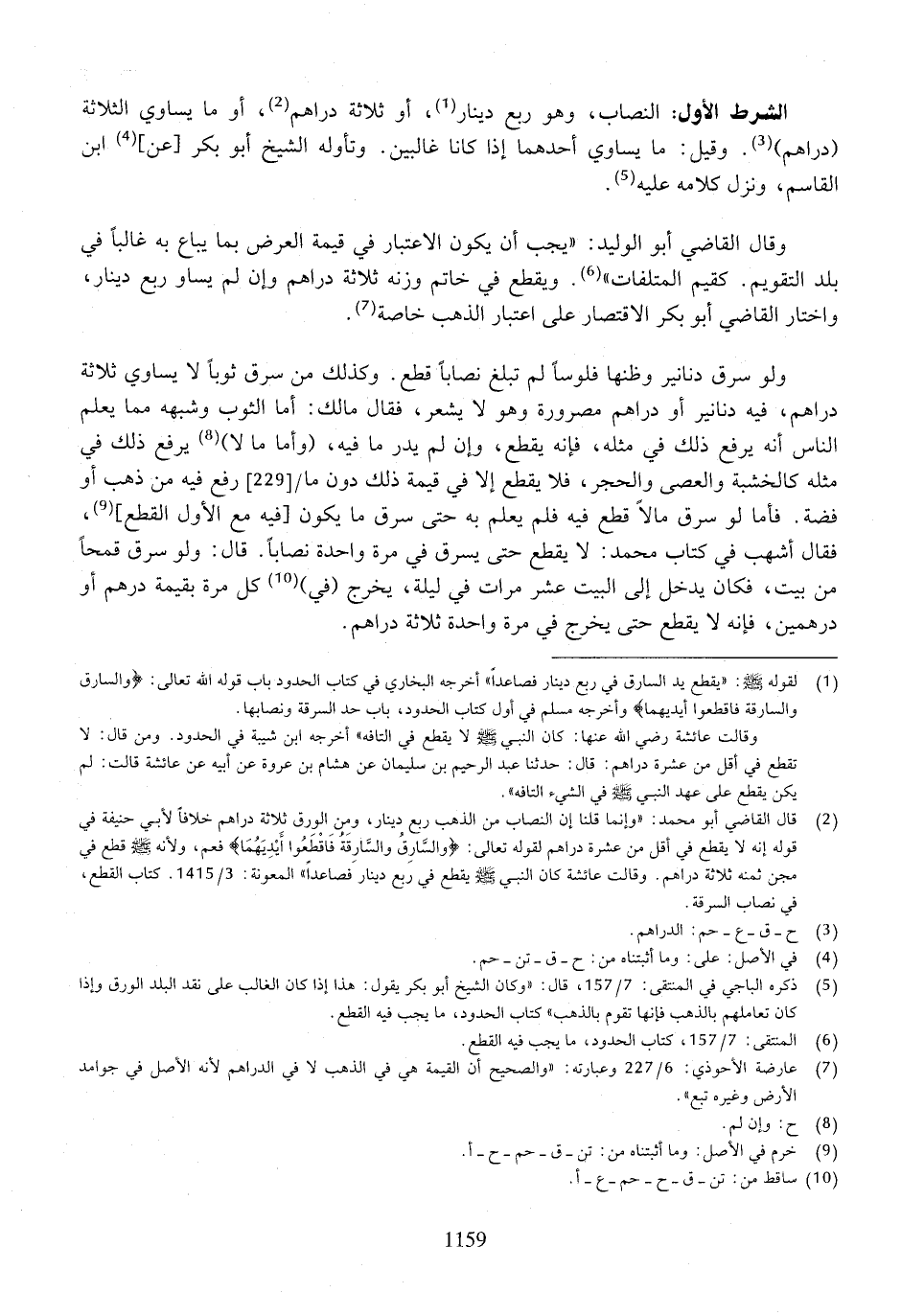 الشرط الأول: النصاب، وهو ربع دينار، أو ثلاثة دراهم، أو ما يساوي الثلاثة (درام). وقيل: ما يساوي أحدهما إذا كانا غالبين. وتأوله الشيخ أبو بكر [عن] ابن القاسم، ونزل كلامه عليه.