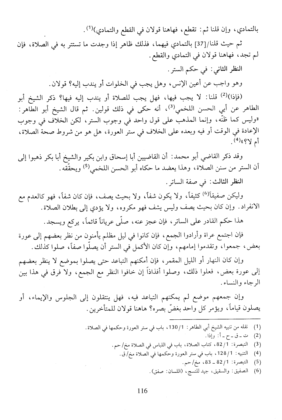 وقد ذكر القاضي أبو محمد: أن القاضيين أبا إسحاق وابن بكير والشيخ أبا بكر ذهبوا إلى أن الستر من سنن الصلاة، وهذا يعضد ما حكاه أبو الحسن اللخمي ويحققه.