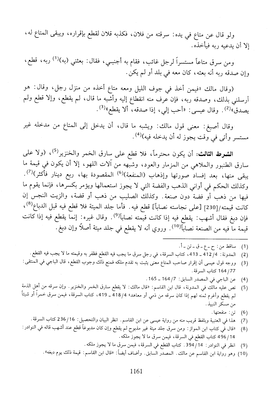 الشرط الثالث: أن يكون محترمًا، فال قطع على سارق الخمر والخنزير، (ولا على سارق الطنبور والملاهي من المزمار والعود، وشبهه من آلات اللهو، إلا أن يكون في قمية ما يبقى منها، بعد إفساد صورتها وإذهاب (المنفعة) المقصودة بها، ربع دينار فأكثر). وكذلك الحكم في أواني الذهب والفضة التي لا يجوز استعمالها ويؤمر بكسرها، فإنما يقوم ما فيها من ذهب أو فضة دون صنعة. وكذلك الصليب من ذهب أو فضة، والزيت النجس إن كانت قيمته [على نجاسته نصابًا]. وقال غيره: إنما يقطع فيه إذا كانت قيمة ما فيه من الصنعة نصابًا. وروي أنه لا يقطع في جلد ميتة أصلاً وإن دبغ.