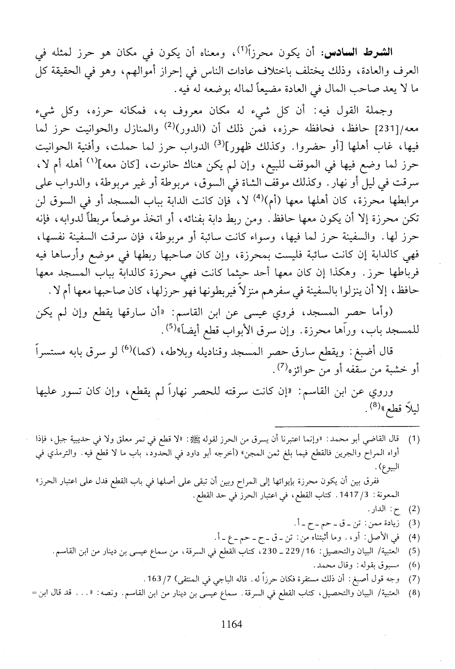 وجملة القول فيه: أن كل شيئ له مكان معروف به، فمكانه حرزه، وكل شيئ معه حافظ، فحافظه حرزه، فمن ذلك أن (الدور) والمنازل والحوانيت حرز لما فيها، غاب أهلها [أو حضروا. وكذلك ظهور] الدواب حرز لما جملت، وأفنية الحوانيت حرز لما وضع فيها في الموقف للبيع، وإن لم يكن هناك حانوت، [كان معه] أهله أم لا، سرقت في ليل أو نهار. وكذلك موقف الشاة في السوق، مربوطة أو غير مربوطة، والدواب على مرابطها محرزة، كان أهلها معها (أم) لا، فإن كانت الدابة بباب المسجد أو في السوق لن تكن محرزة إلا أن يكون معها حافظ. ومن ربط دابة بفنائه، أو اتخذ موضعًا مربطًا لدوابه، فإنه حرز لها. والسفينة حرز لما فيها، وسواء كانت سائبة أو مربوطة، فإن سرقت السفينة نفسها، فهي كالدابة إن كانت سائبة فليست بمحرزة، وإن كان صاحبها ربطها في موضع وأرساها فيه فرباطها حرز. وهكذا إن كان معها أحد حيثما كانت فهي محرزة كالدابة باب المسجد معها حافظ، إلا أن ينزلوا بالسفينة في سفرهم منزلاً فيربطونها فهو حرز لها، كان صاحبها معها أم لا.