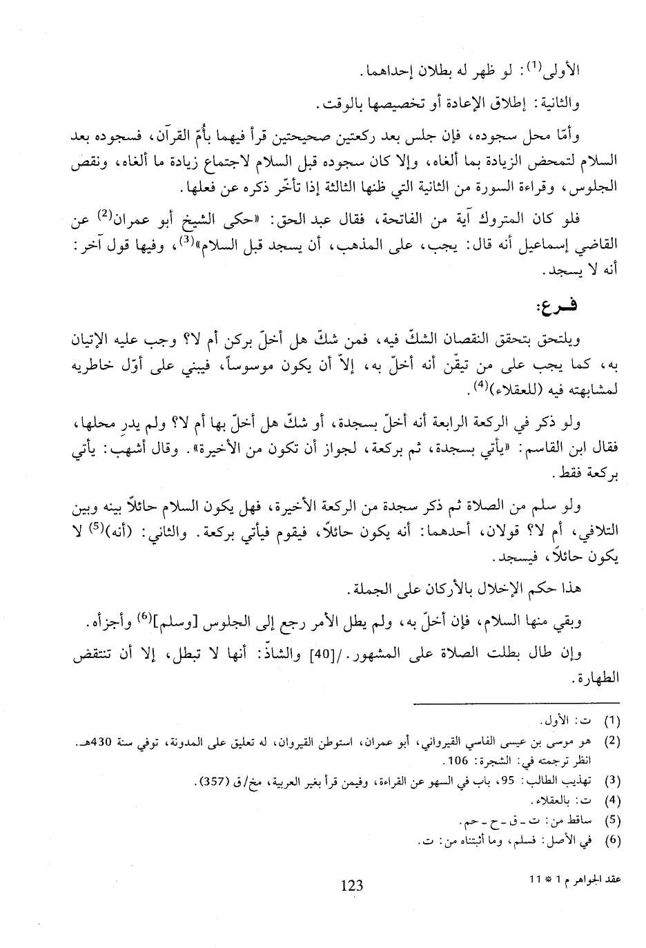 وإن طال بطلت الصلاة على المشهور. والشاذ: أنها لا تبطل، إلا أن تنتقض الطهارة.