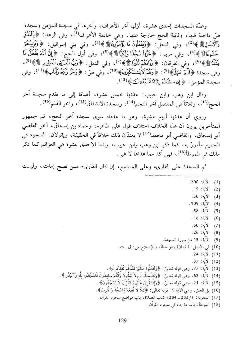 وعدة السجدات إحدى عشرة، أولها آخر الأعراف، وآخرها في سجدة المؤمن وسجدة ص داخلة فيها، وثانية الحج خارجة عنها. وهي خاتمة الأعراف، وفي الرعد: {بالغدو والآصال}، وفي النحل: {ويفعلون ما يؤمرون}، وفي بني إسرائيل: {ويزيدهم خشوعا}، وفي مريم: {خروا سجدا وبكيا}، وفي أول الحج: {الله يفعل ما يشاء}، وفي الفرقان: {وزادهم نفورا}، وفي النمل: {رب العرش العظيم}، وفي سجدة {الم تنزيل}: {وهم لا يستكبرون}، وفي ص: {وخر راكعا وأناب}، وفي سجدة المؤمن: {إن كنتم إياه تعبدون}.