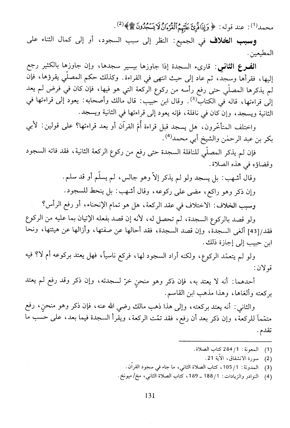 الفرع الثاني: قارئ السجدة إذا جاوزها بيسير سجدها، وإن جازها الكثير رجع إليها، فقرأها وسجد، ثم عاد إلى حيث انتهى في القراءة. وكذلك حكم المصلي يقرؤها، فإن لم يذكرها المصلي حتى رفع رأسه من ركوع الركعة التي هو فيها، فإن كان في فرض لم يعد إلى قراءتها، قاله في الكتاب. وقال ابن حبيب: قال مالك وأصحابه: يعود إلى قراءتها في الثانية ويسجد، وإن كان في نافلة، فإنه يعود إلى قراءتها في الثانية ويسجد.