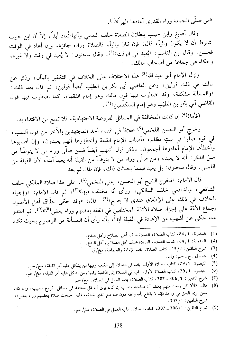 قال الإمام: " فخرج الشيخ أبو الحسن، يعني الخمي، على هذا صلاة المالكي خلف الشافعي، خلف المالكي، ورأى أنه يختلف فيها "، ثم قال الإمام: " وإجراء الخلاف ي ذلك على الإطلاق عندي لا يصح ". قال: " وقد حكى حذاق أهل الأصول إجماع الأمة على إجزاء صلاة الأئمة المختلفين في الفقه بعضهم وراء بعض "، ثم اعتذر عما حكى عن أشهب من الإعادة في القبلة أبدا، بأنه رأى أن المسألة من الوضوح بحيث تكاد