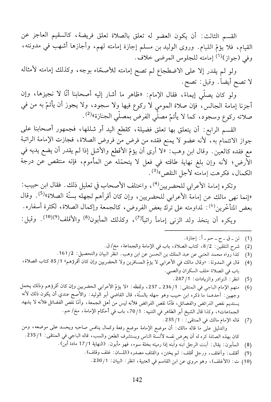 القسم الثالث: أن يكون العضو له تعلق بالصلاة تعلق فريضة، كالسقيم العاجز عن القيام، فلا يؤم القيام. وروى الوليد بن مسلم إجازة إمامته لهم، وأجزها أشهب في مدونته، وفي (جواز) إمامته للجلوس المرضى خلاف.
