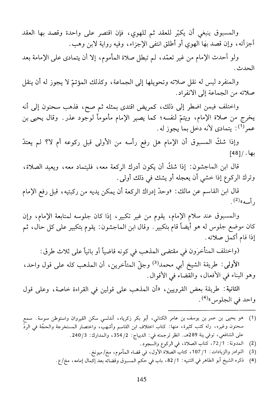 والمسبوق عند سلام الإمام، يقوم من غير تكبير، إذا كان جلوسه لمتابعة الإمام، وإن كان موضع جلوس له هو أيضا قام بتكبير. وقال ابن الماجشون: يقوم بتكبير على كل حال، ثم إذا قام أكمل صلاته.