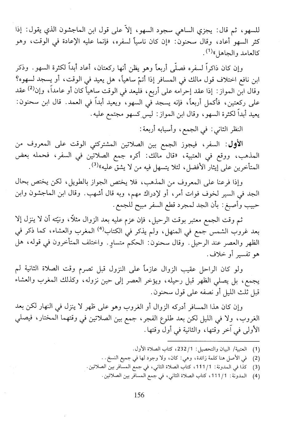 ثم وقت الجمع معتبر بوقت الرحيل، فإن عزم عليه بعد الزوال مثلا، ونيته أن لا ينزل إلا بعد غروب الشمس جمع في المنهل، ولم يذكر في الكتاب المغرب والعشاء، كما ذكر في الظهر والعصر عند الرحيل. قول سحنون: الحكم متساو. واختلف المتأخرون في قوله، هل هو تفسير أو خلاف.