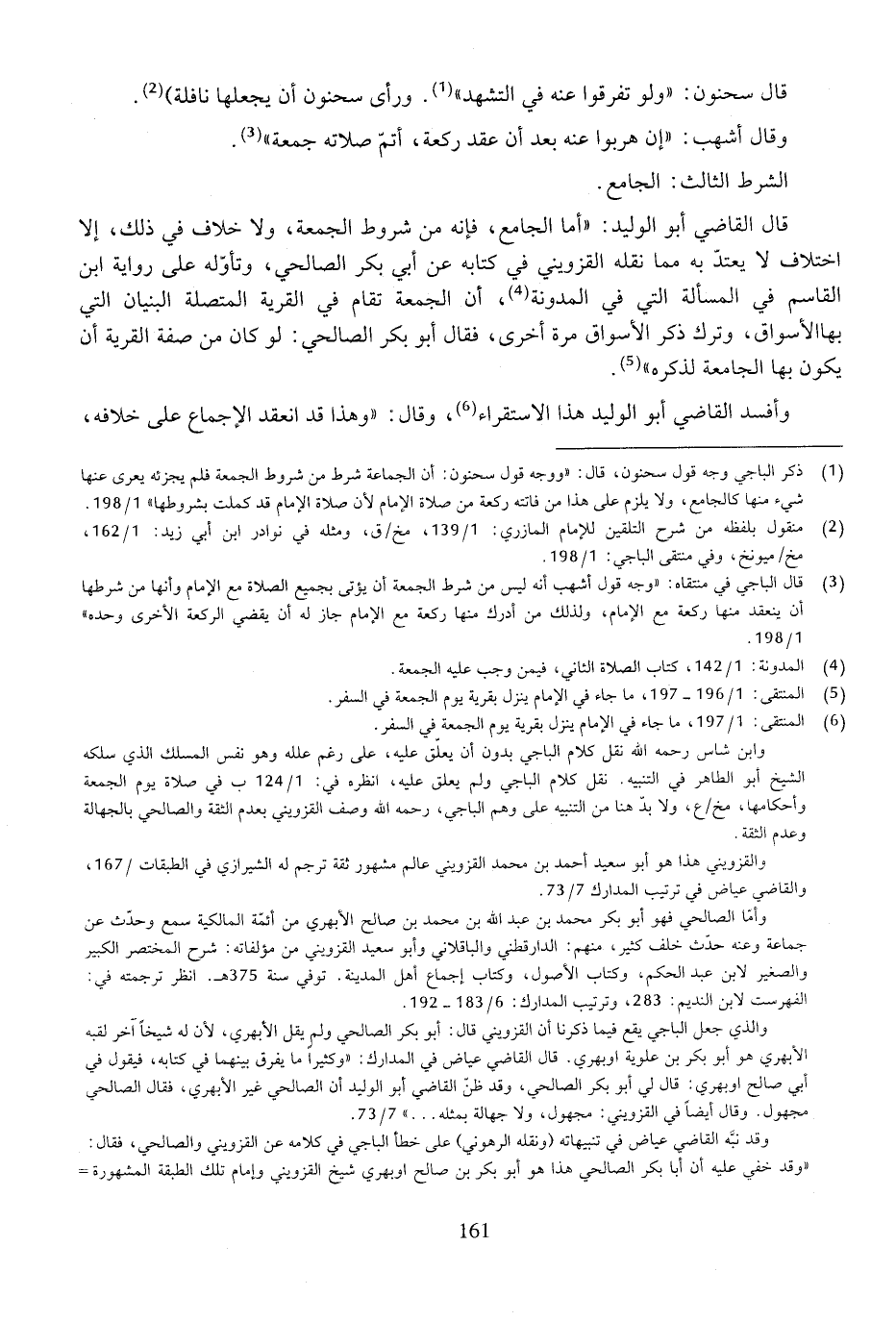 قال القاضي أبو الوليد: " أما الجامع، فإنه من شروط الجمعة، ولا خلاف في ذلك، إلا اختلاف لا يعتد به مما نقله القزويني في كتابه عن أبي بكر الصالحي، وتأوله على رواية ابن القاسم في المسألة التي في المدونة، أن الجمعة تقام في القرية المتصلة البنيان التي بها الأسواق، وترك ذكر الأسواق مرة أخرى، فقال أبو بكر الصالحي: لو كان من صفة القرية أن يكون بها الجامعة لذكره ".