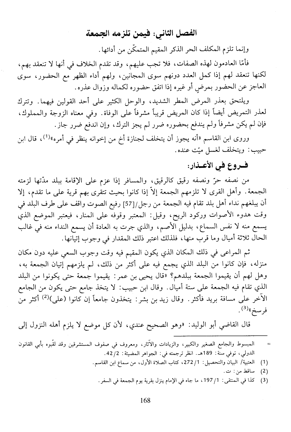 ثم المراعي في ذلك المكان الذي يكون المقيم فيه وقت وجوب السعي إليه دون مكان منزله، فإن كانوا من البلد الذي يجمع فيه على أكثر من ذلك، لم يلزمهم إتيان الجمعة به، وهل لهم أن يقيموا الجعة ببلدهم؟ " قال يحيى بن عمر: يقيموا جمعة حتى يكونوا من البلد الذي تقام فيه الجمعة على ستة أميال. وقال ابن حبيب: لا يتخذ جامع حتى يكون م الجامع الآخر على مسافة بريد فأكثر. وقال زيد بن بشر: يتخذون جامعا إن كانا (على) أكثر من فرسخ ".