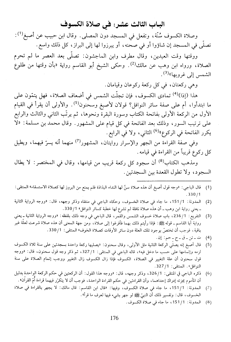 وصلاة الكسوف سنة، وتفعل في المسجد دون المصلى. وقال ابن حبيب عن أصبغ: تصلي في المسجد إن شاؤوا أو في صحته، أو يبروزا لها إلى البراز، كل ذلك واسع.