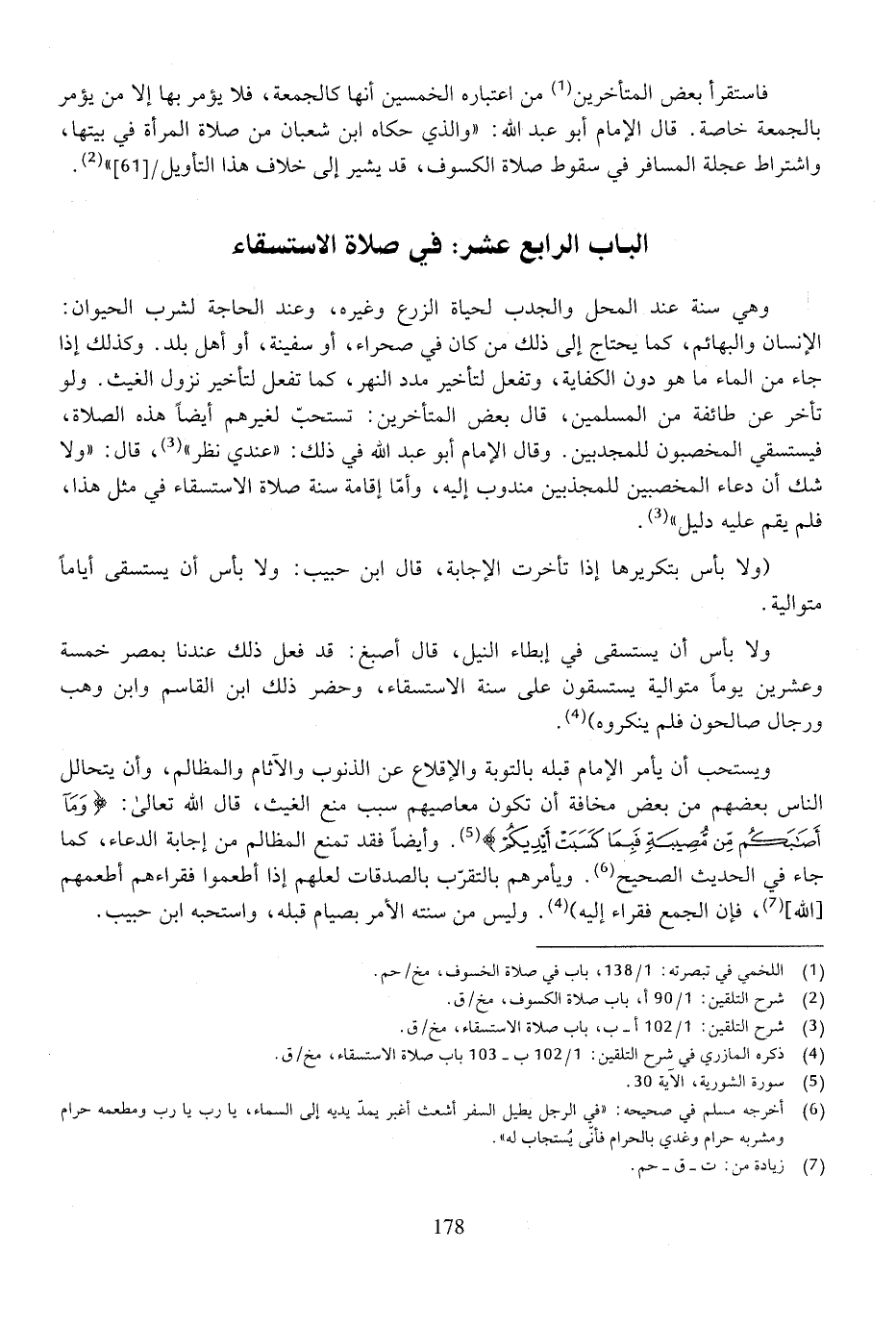 وهي سنة عند المحل والجدب لحياة الزرع وغيره، وعند الحاجة لشرب الحيوان: الإنسان والبهائم، كما يحتاج إلى ذلك من كان في صحراء، أو سفينة، أو أهل بلد. وكذلك إذا جاء من الماء ما هو دون الكفاية، وتفعل لتأخير مدد النهر، كما تفعل لتأخير نزول الغيث. ولو تأخر عن طائفة من المسلمين، قال بعض المتأخرين: تستحب لغيرهم أيضا هذه الصلاة، فيستسقي المخصبون للمجدبين. وقال الإمام أبو عبد الله في ذلك: " عندي نظر "، قال: " ولا شك أن دعاء المخصبين للمجذبين مندوب إليه، وأما إقامة سنة صلاة الاستسقاء في مثل هذا، فلم يقم عليه دليل ".