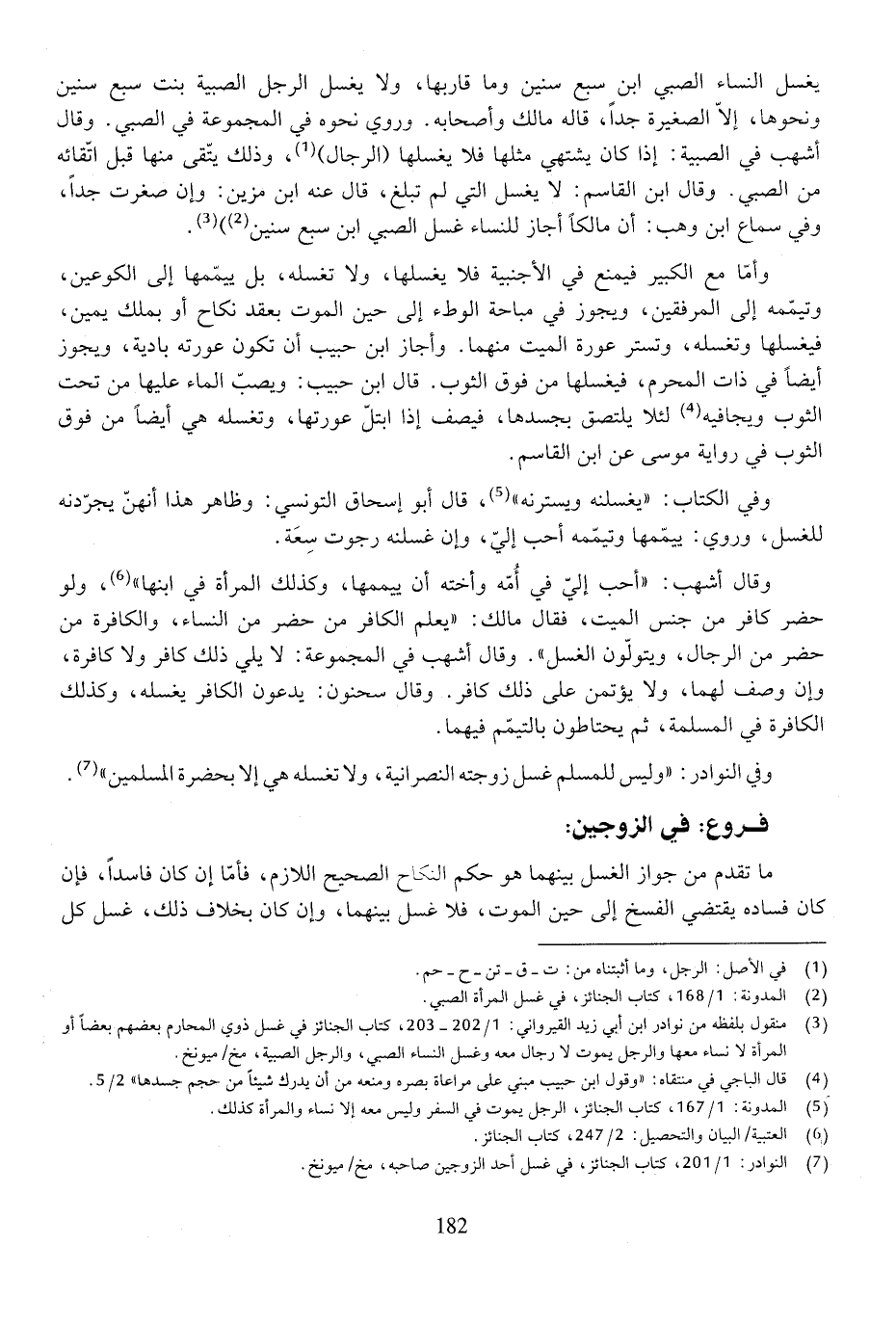 يغسل النساء الصبي ابن سبع سنين وما قاربها، ولا يغسل الرجل الصبية بنت سبع سنين ونحوها، إلا الصغيرة جدا، قاله مالك وأصحابه. وروى نحوه في المجموعة في الصبي. وقال أشهب في الصبية: إذا كان يشتهي مثلها فلا يغسلها (الرجال)، وذلك يتقى منها قبل اتقائه من الصبي. وقال ابن القاسم: لا يغسل التي لم تبلغ، قال عنه ابن مزين: وإن صغرت جدا، وفي سماع ابن وهب: إن مالكا أجاز للنساء غسل الصبي ابن سبع سنين.