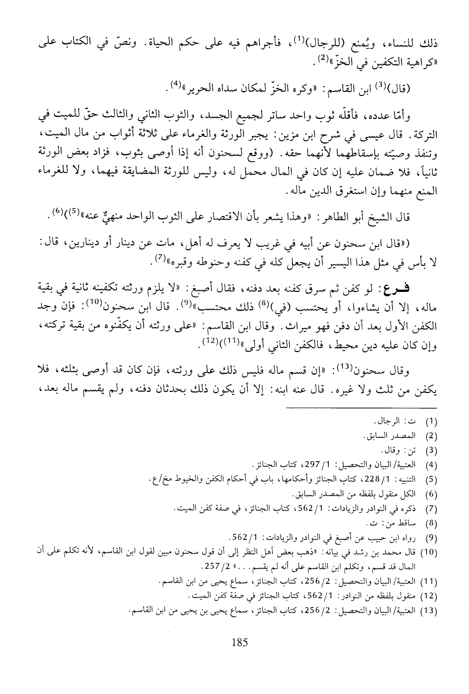 وقال سحنون: " إن قسم ماله فليس ذلك على ورثته، فإن كان قد أوصى بثلثه، فلا يكفن من ثلث ولا غيره. قال عنه ابنه: إلا أن يكون ذلك بحدثان دفنه، ولم يقسم ماله بعد،