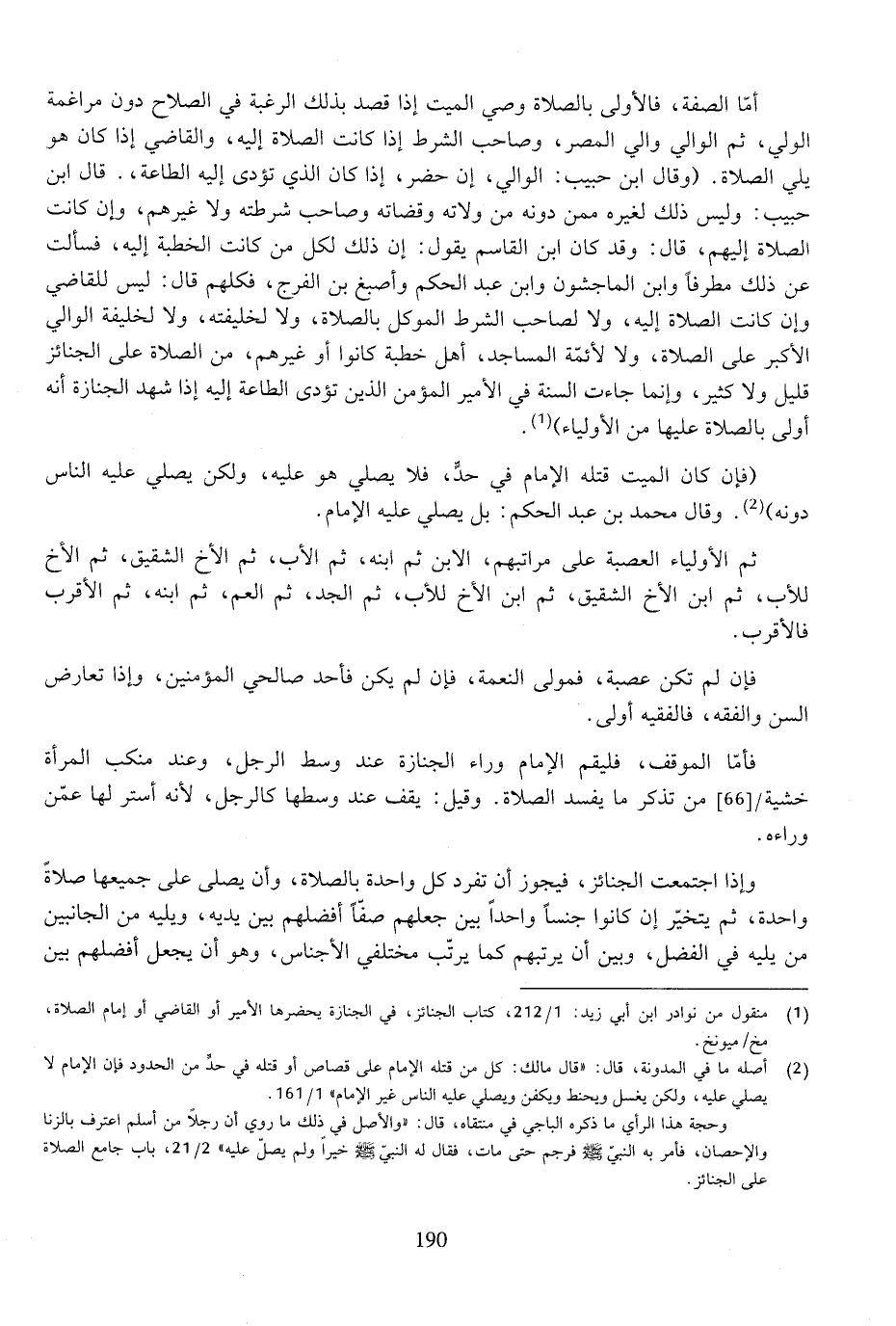 أما الصفة، فالأولى بالصلاة وصي الميت إذا قصد بذلك الرغبة في الصلاح دون مراغمة الولي، ثم الوالي والي المصري، وصاحب الشرط إذا كانت الصلاة إليه، والقاضي إذا كان هو يلي الصلاة. (وقال ابن حبيب: الوالي، إن حضر، إذا كان الذي تؤدي إليه الطاعة، قال ابن حبيب: وليس ذلك لغيره ممن دونه من ولاته وقضاته وصاحب شرطته ولا غيرهم، وإن كانت الصلاة إليهم، قال: وقد كان ابن القاسم يقول: إن ذلك لكل من كانت الخطبة إليه، فسألت عن ذلك مطرفا وابن الماجشون وابن عبد الحكم وأصبغ بن الفرج، فكلهم، قال: ليس للقاضي وإن كانت الصلاة إليه، ولا لصاحب الشرط الموكل بالصلاة، ولا لخليفته، ولا لخليفة الوالي الأكبر على الصلاة، ولا لأئمة المساجد، أهل خطبة كانوا أو غيرهم، من الصلاة على الجنائز قليل ولا كثير، وإنما جاءت السنة في الأمير المؤمن الذين تؤدي الطاعة إليه إذا شهد الجنازة أنه أولى بالصلاة عليها من الأولياء).