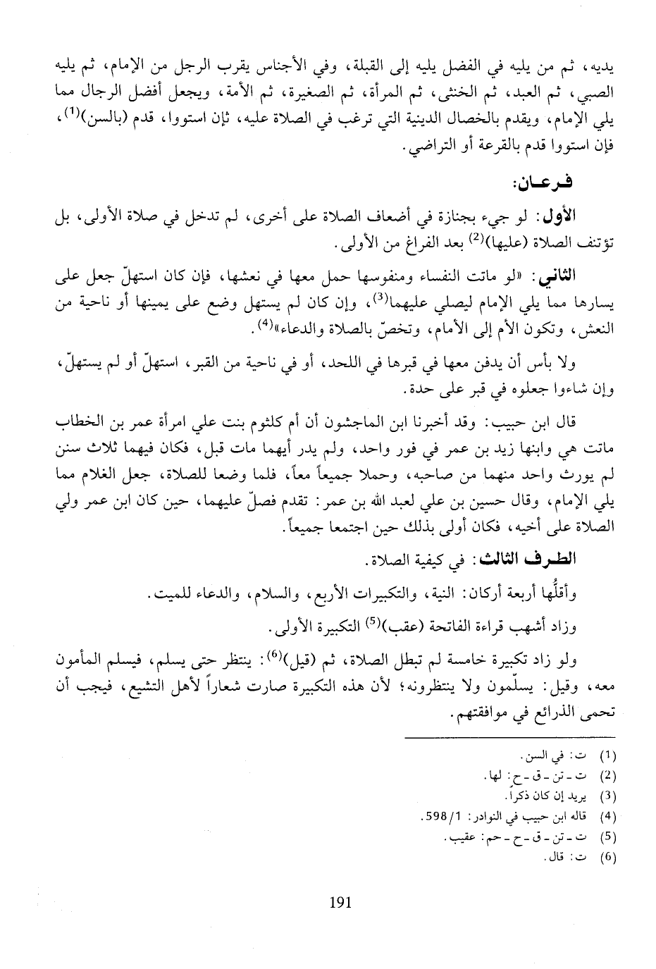 يديه، ثم من يليه في الفضل يليه إلى القبلة، وفي الأجناس يقرب الرجل من الإمام، ثم يليه الصبي، ثم العيد، ثم الخنثى، ثم المرأة، ثم الصغيرة، ثم الأمة، ويجعل أفضل الرجال مما يلي الإمام، ويقدم الخصال الدينية التي ترغب في الصلاة عليه، إن استووا، قدم (بالسن)، فإن استووا قدم بالقرعة أو التراضي.