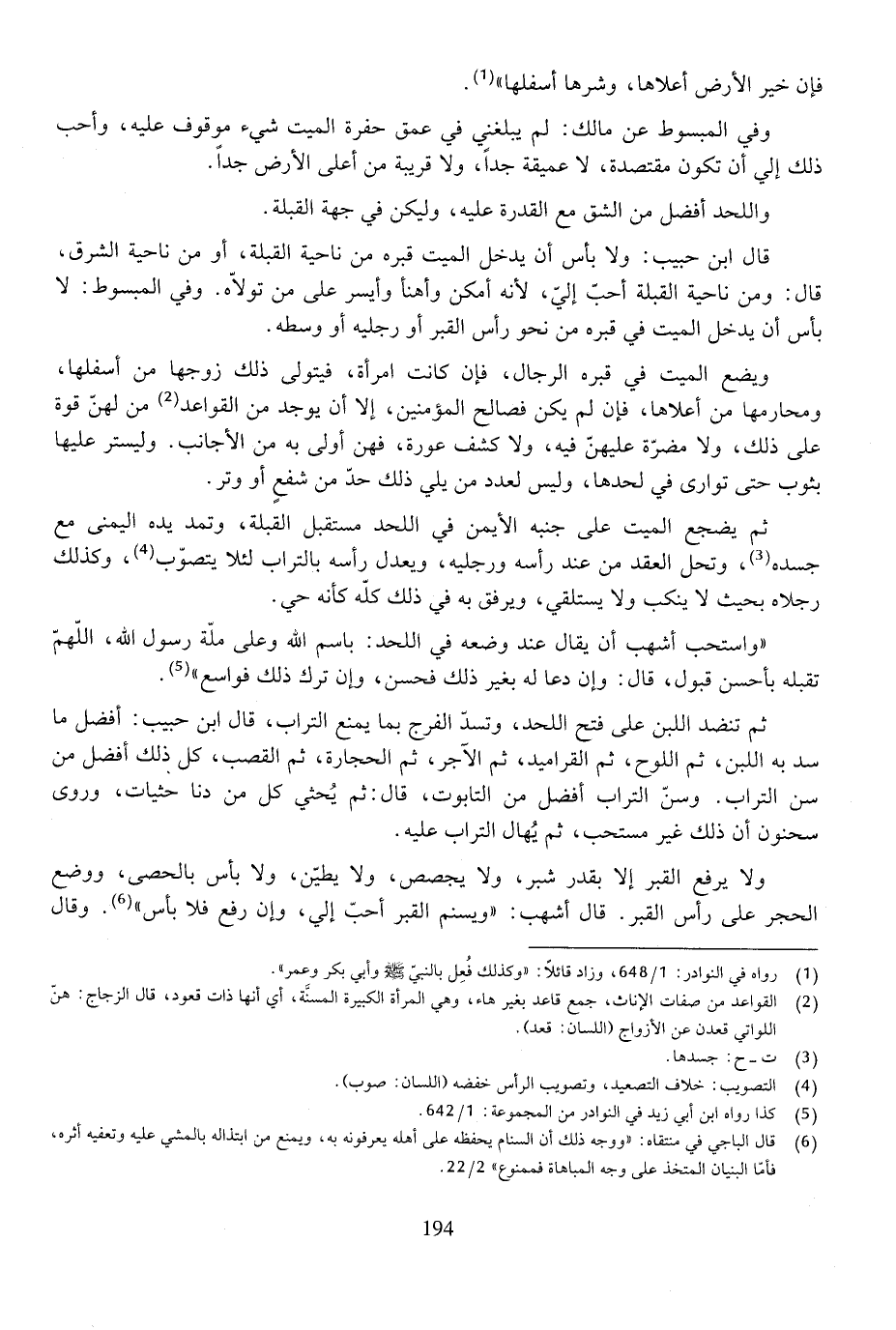 ولا يرفع القبر إلا بقدر شبر، ولا يجصص، ولا يطين، ولا بأس بالحصى، ووضع الحجر على رأس القبر. قال أشهب: " ويسنم القبر أحب إلي، وإن رفع فلا بأس ". وقال