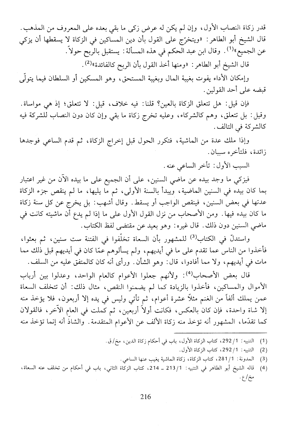 واستدل في الكتاب للمشهور بأن السعاة تخلفوا في الفتنة ست سنين، ثم بعثوا، فأخذوا من الناس عما تقدم على ما في أيديهم، ولم يسألوهم عما كان في أيديهم قبل ذلك مما مات في أيديهم، ولا مما أفادوا، قال: وهو الشأن. ورأى أنه كان كالمتفق عليه من السلف.
