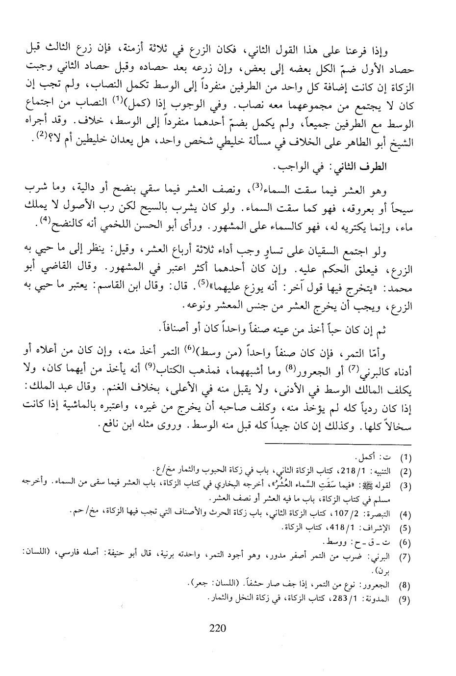 وهو العشر فيما سقت السماء، ونصف العشر فيما سقي بنضح أو دالية، وما شرب سيحا أو بعروقه، فهو كما سقت السماء. ولو كان يشرب بالسيح لكن رب الأصول لا يملك ماء، وإنما يكتريه له، فهو كالسماء على المشهور. ورأى أبو الحسن اللخمي أنه كالنضح.