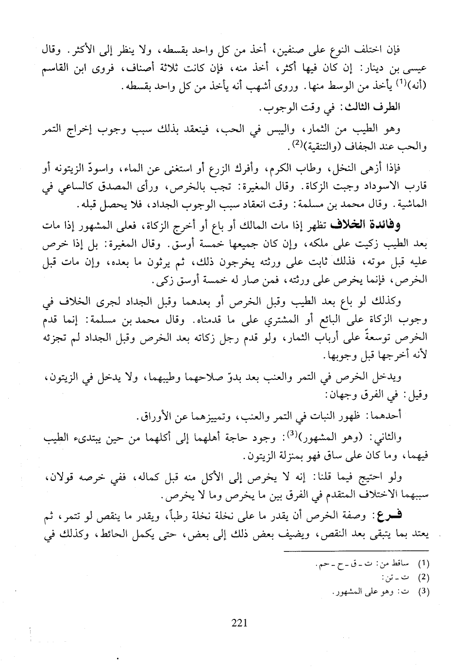 فإذا أزهى النخل، وطاب الكرم، وأفرك الزرع أو استغنى عن الماء، واسود الزيتونة أو قارب الاسوداد وجبت الزكاة. وقال المغيرة: تجب بالخرص، ورأى المصدق كالساعي في الماشية. وقال محمد بن مسلمة: وقت انعقد سبب الوجوب الجداد، فلا يحصل قبله.