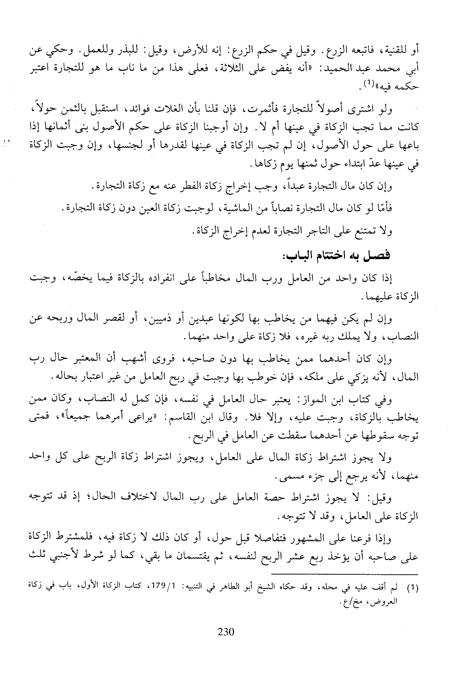 أو للقنية، فاتبعه الزرع. وقيل في حكم الزرع: إنه للأرض، وقيل: للبذر وللعمل. وحكي عن أبي محمد عبد الحميد: " أنه يفض على الثلاثة، فعلى هذا من ما ناب ما هو للتجارة اعتبر حكمه فيه ".