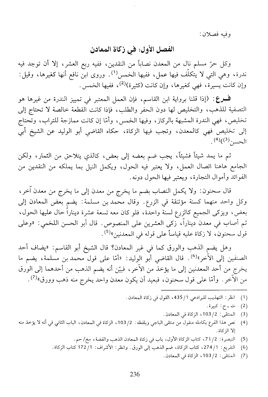 وهل يضم الذهب والورق كما في غير المعادن؟ قال الشيخ أبو القاسم: " يضاف أحد الصنفين إلى الآخر ". قال القاضي أبو الوليد: " أما على قول محمد بن مسلمة، يضم ما ي خرجد من أحد المعدنين إلى ما يؤخذ من الآخر، فبين أنه يضم الذهب من أحدهما إلى الورق من الآخر. وأما على قول سحنون، فبعيد أن يكون معدن واحد يخرج منه ذهب وورق ".