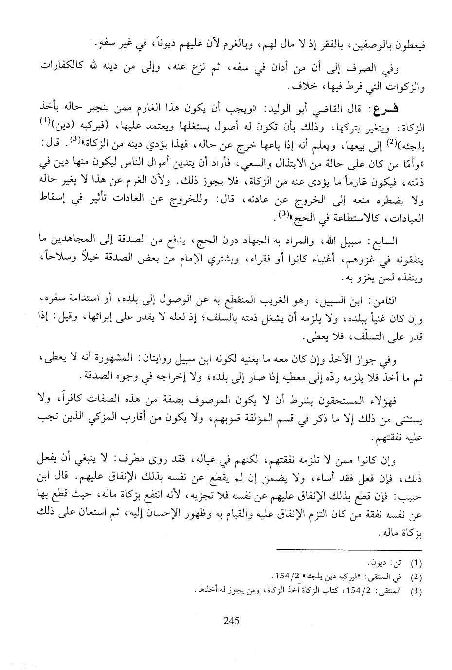 فهؤلاء المستحقون بشرط أن لا يكون الموصوف بصفة من هذه الصفات كافرا، ولا يستثنى من ذلك إلا ما ذكر في قسم المؤلفة قلوبهم، ولا يكون من أقارب المزكي الذي تجب عليه نفقتهم.