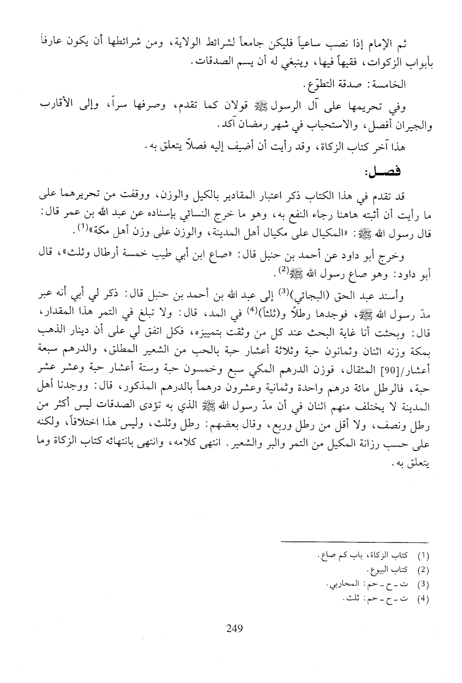 وأسند عبد الحق (البجائي) إلى عبد الله بن أحمد بن حنبل قال: ذكر لي أبي أنه عبر مد رسول الله صلى الله عليه وسلم، فوجدها رطلا و (ثلثا) في المد، قال: ولا تبلغ في التمر هذا المقدار، قال: وبحثت أنا غاية البحث عند كل من وثقت بتمييزه، فكل اتفق لي على أن دينار الذهب بمكة وزنه اثنان وثمانون حبة وثلاثة أعشار حبة بالحب من الشعير المطلق، والدرهم سبعة أعشار المثقال، فوزن الدرهم المكي سبع وخمسون حبة وستة أعشرا حبة وعشر عشر حبة، فالرطل مائة درهم واحدة وثمانية وعشرون درهما بالدرهم المذكور، قال: ووجدنا أهل المدينة لا يختلف منهم اثنان في أن مد رسول الله صلى الله عليه وسلم الذي به تؤدى الصدقات ليس أكثر من رطل ونصف، ولا أقل من رطل وربع، وقال بعضهم: رطل وثلث: وليس هذا اختلافا، ولكنه على حسب رزانة المكيل من التمر والبر والشعير. انتهى كلامه، وانتهى بانتهائه كتاب الزكاة ما يتعلق به.