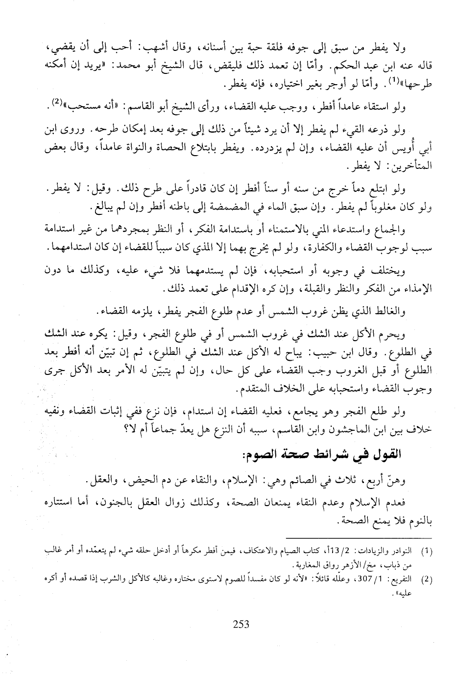 ولا يفطر من سبق إلى جوفه فلقة حبة بين أسنانه، وقال أشهب: أحب إلي أن يقضي، قاله عنه ابن عبد الحكم. وأما ذلك فليقض، قال الشيخ أبو محمد: " يريد أن أمكنه طرحها. وأما لو أوجز بغير اختيار، فإنه يفطر.