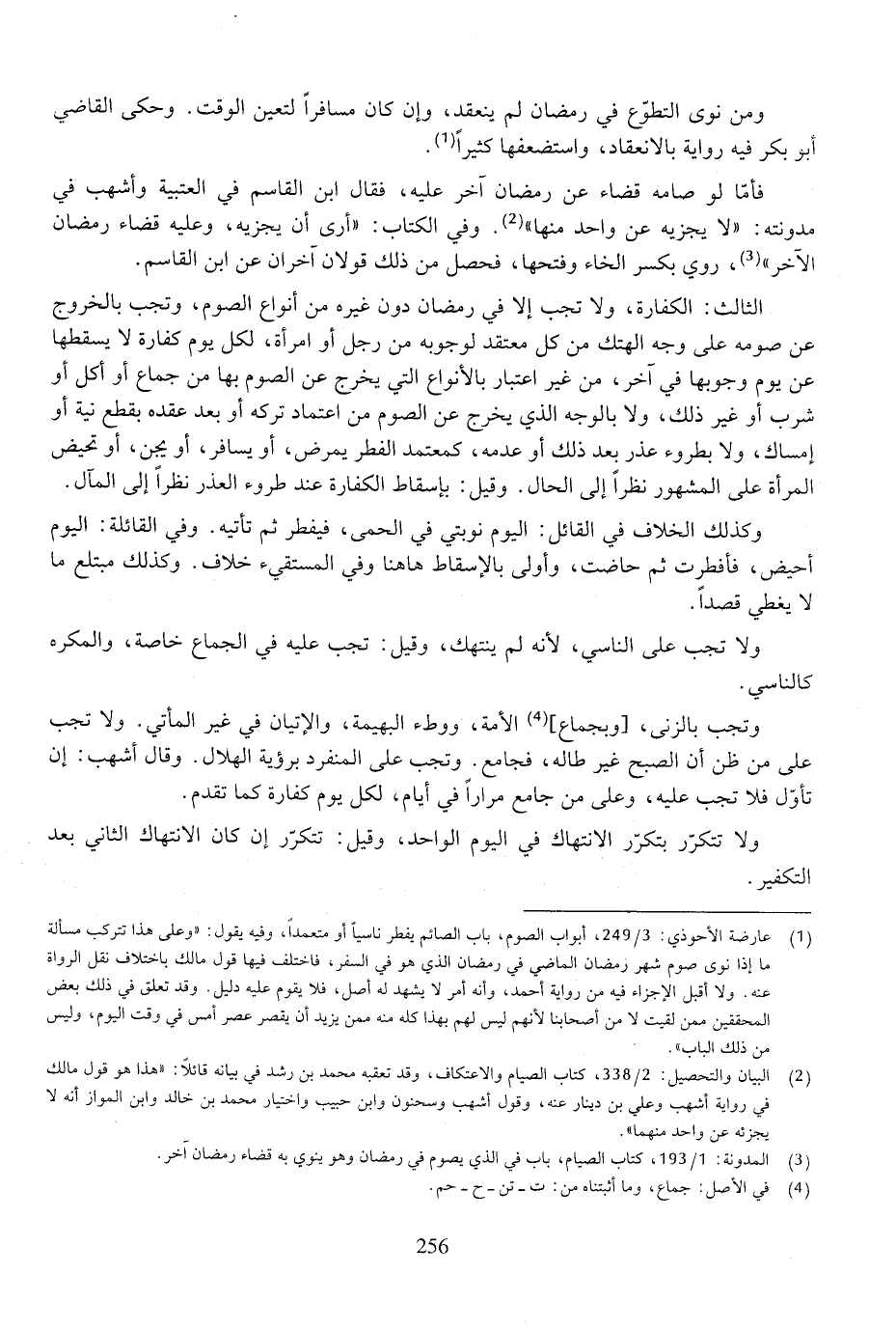 الثالث: الكفارة، ولا تجب إلا في رمضان دون غيره من أنواع الصوم، وتجب بالخروج عن صومه على وجه الهتك من كل معتقد لوجوبه من رجل أو امرأة، لكل يوم كفارة لا يسقطها عن ويم وجوبها في آخر، من غير اعتبار بالأنواع التي يخرج عن الصوم بها من جماع أو أكل أو شرب أو غر ذلك، ولا بالوجهة الذي يخرج عن الصوم من اعتماد تركه أو بعد عقده بقطع نية أو إمساك، ولا بطروء عذر بعد ذلك أو عدمه، كمعتمد الفطر يمرض، أو يسافر، أو يجن، أو تحيض المرأة على المشهور نظرا إلى الحال شيء وقيل: بإسقاط الكفارة عند طروء العذر نظرا إلى المآل.