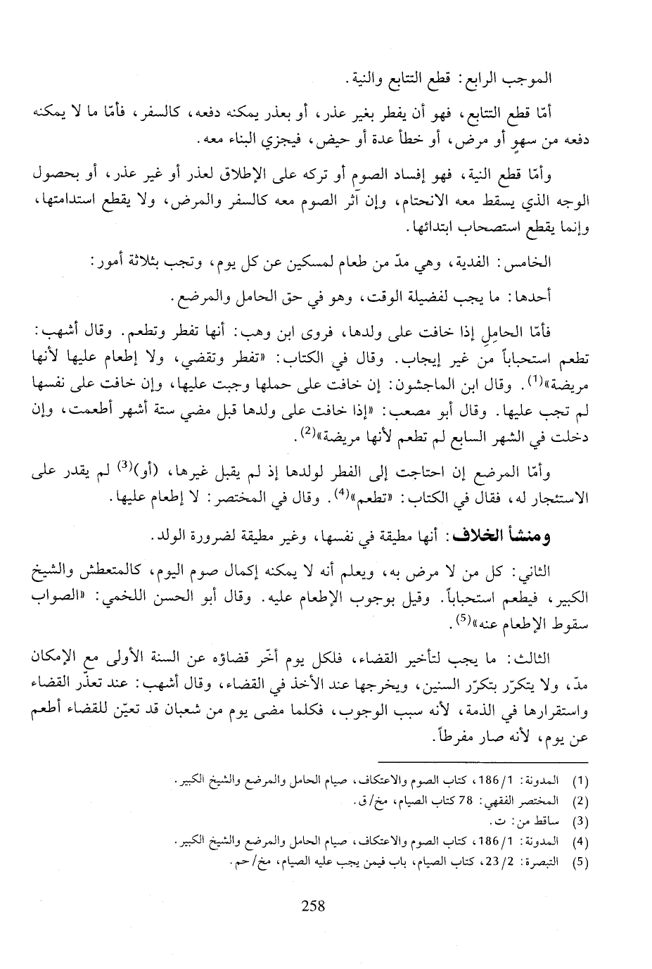 وأما قطع النية، فهو إفساد الصوم أو تركه على الإطلاق لعذر أو غير عذر، أو بحصول الوجه الذي يسقط معه الانحتام، وإن آثر الصوم معه كالسفر والمرض، ولا يقطع استدامتها، وإنما يقطع استصحاب ابتدائها.