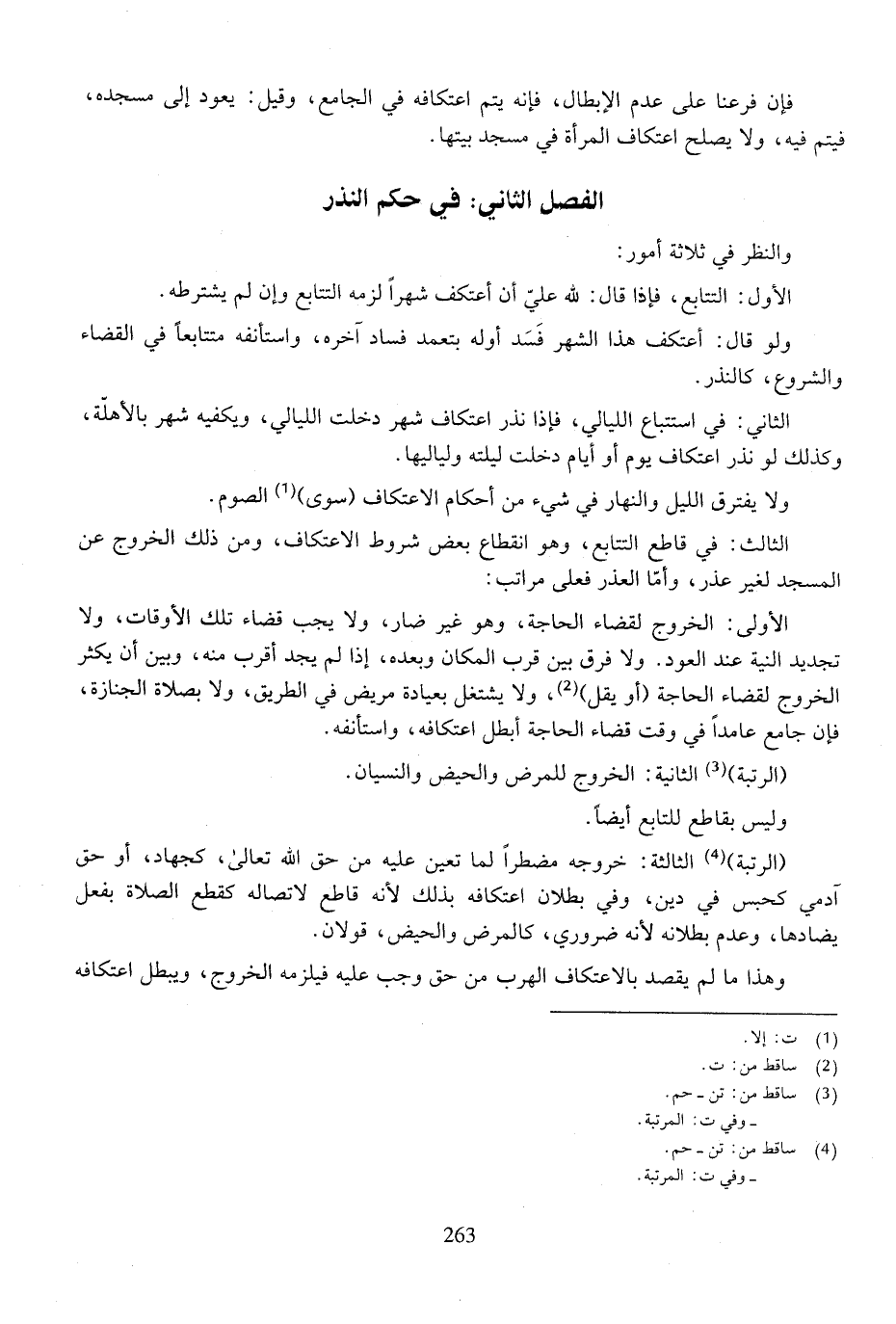 (الرتبة) الثالثة: خروجه مضطرا لما تعين عليه من حق الله تعالى، كجهاد، أو حق آدمي كحبس في دين، وفي بطلان اعتكافه بذلك لأنه قاطع لاتصاله كقطع الصلاة بفعل يضادها، وعدم بطلانه لأنه ضروري، كالمرض والحيض، قولان.