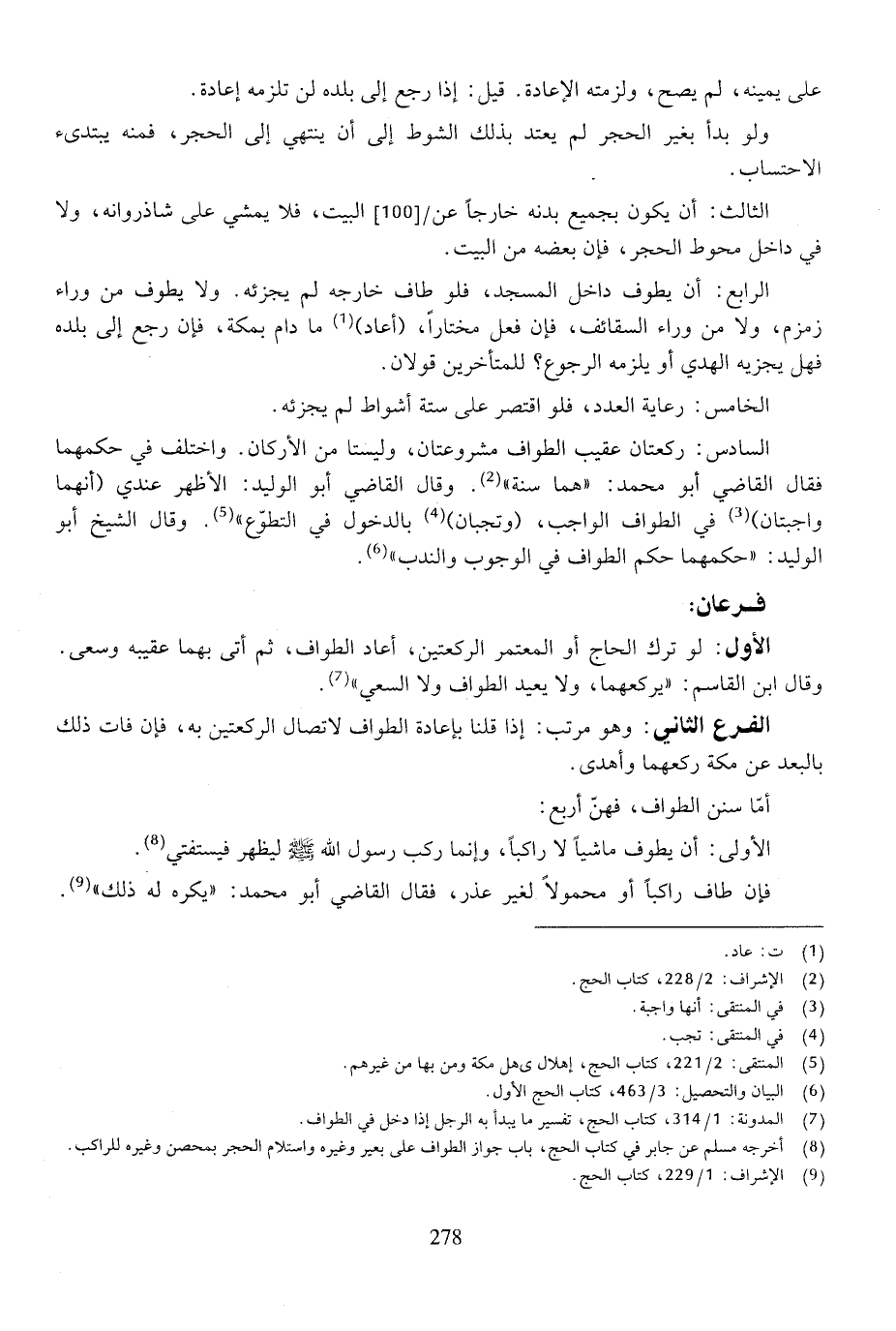 السادس: ركعتان عقيب الطواف مشروعتان، وليستا من الأركان. واختلف في حكمهما فقال القاضي أبو محمد: " هما ستة ". وقال القاضي أبو الوليد: الأظهر عندي (أنهما واجبتان) في الطواف الواجب، (وتجبان) بالدخول في التطوع ". وقال الشيخ أبو الوليد: " حكمهما حكم الطواف في الوجوب والندب ".