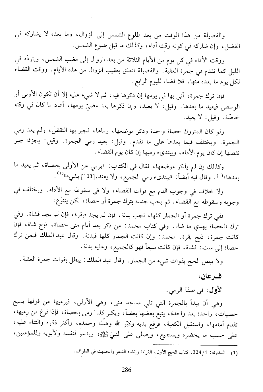 وهي أن يبدأ بالجمرة التي تلي مسد منى، وهي الأولى، فيرميها من فوقها بسبع حصيات، واحدة بعد واحد، يتبع بعضها بعضا، ويكبر كلما رمى بحصاة، فإذا فرغ من رميها، تقدم أمامها، واستقبل الكعبة، فرفع يده وكبر الله وهلله وحمده، وأكثر ذكره والثناء عليه، على حسب ما يحضره ويستطيع، ويصلي على النبي صلى الله عليه وسلم، ويدعو لنفسه ولأبويه وللمؤمنين،