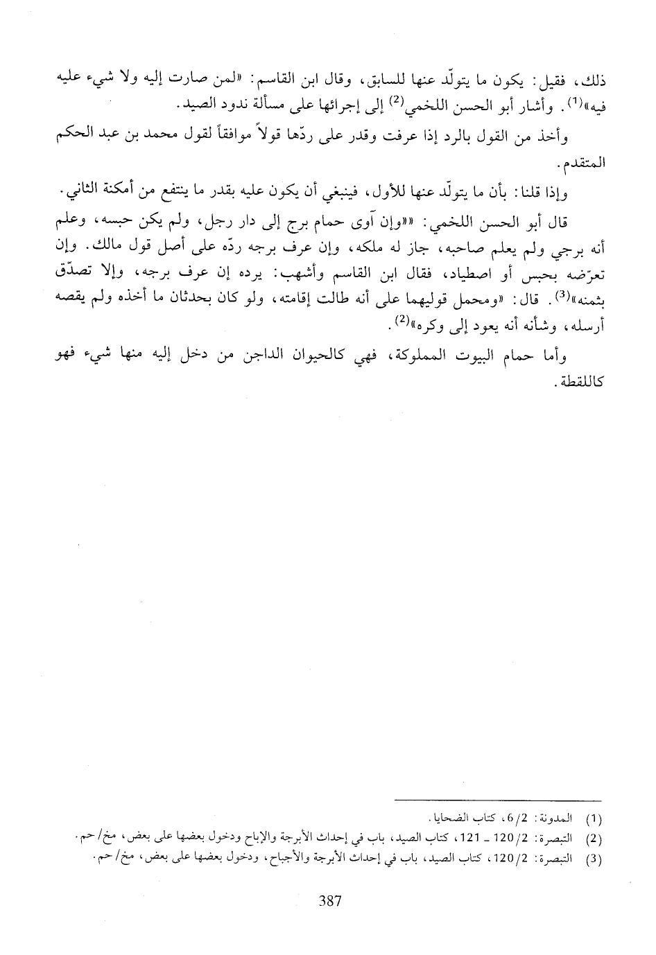 قال أبو الحسن اللخمي: ((وإن آوى حمام برج إلى دار رجل، ولم يكن حبسه، وعلم أنه برجي ولم يعلم صاحبه، جاز له ملكه، وإن عرف برجه رده على أصل قول مالك. وإن تعرضه بحبس أو اصطياد، فقال ابن القاسم وأشهب: يرده إن عرف برجه، وإلا تصدق بثمنه)). قال: ((ومحمل قوليهما على أنه طالت إقامته، ولو كان بحدثان ما أخذه ولم يقصه أرسله، وشأنه أنه يعود إلى وكره)).